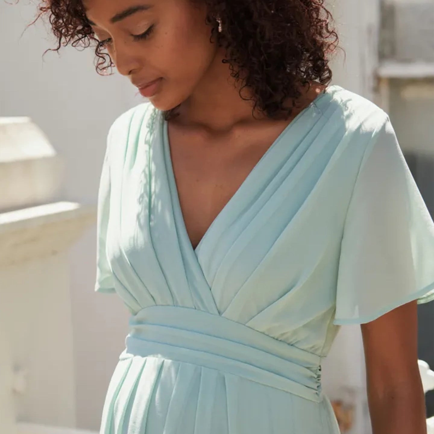 Leichte Stoffe wie Chiffon und Seide sind sehr angenehm zu tragen. Ein flatternder Rock umspielt den Babybauch und wirkt verspielt. Blau- und Aquatöne sind diese Saison besonders angesagt und sehen besonders elegant aus, wie unser festliches Umstands- und Stillkleid mit Spitze mint.