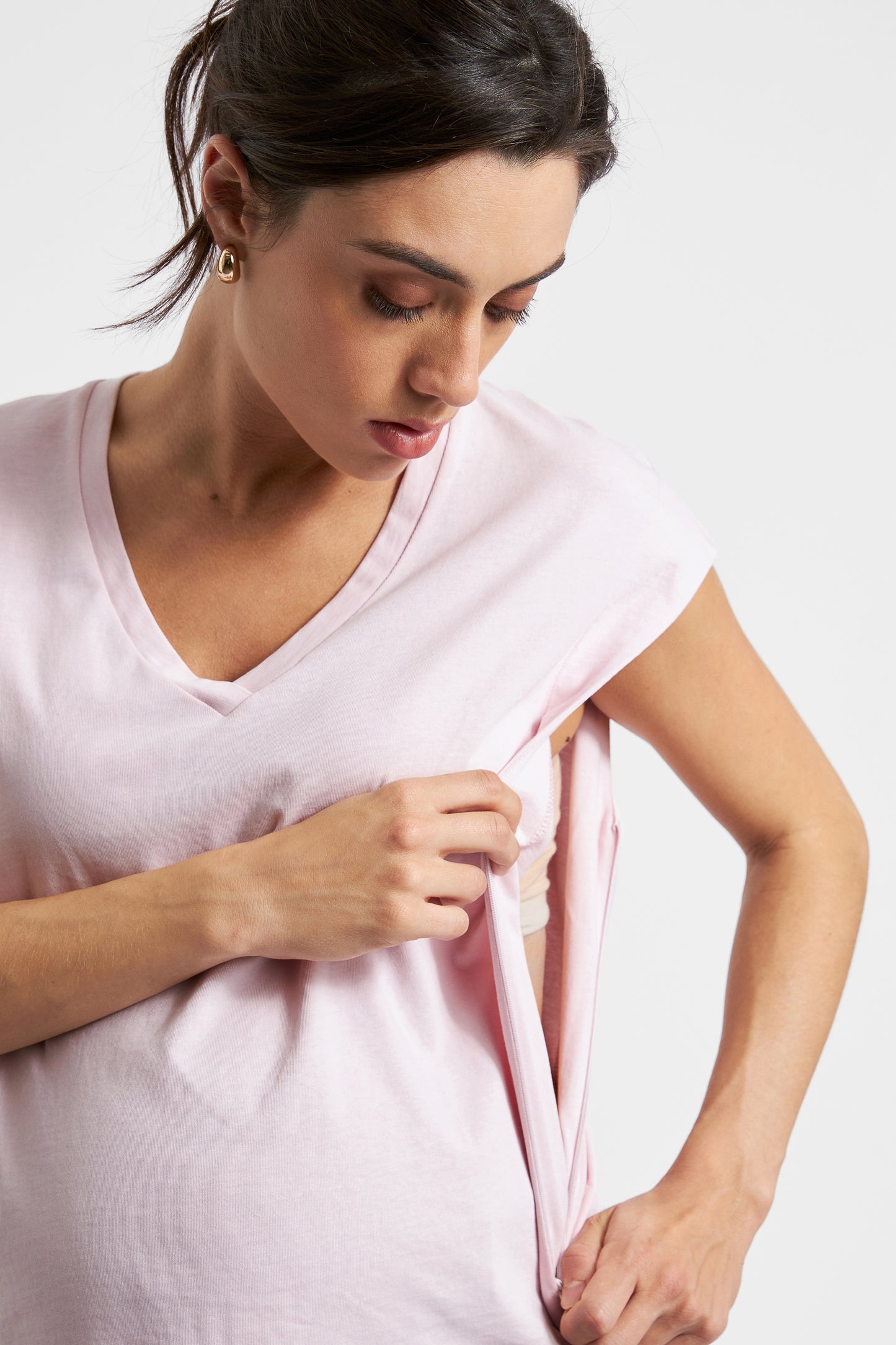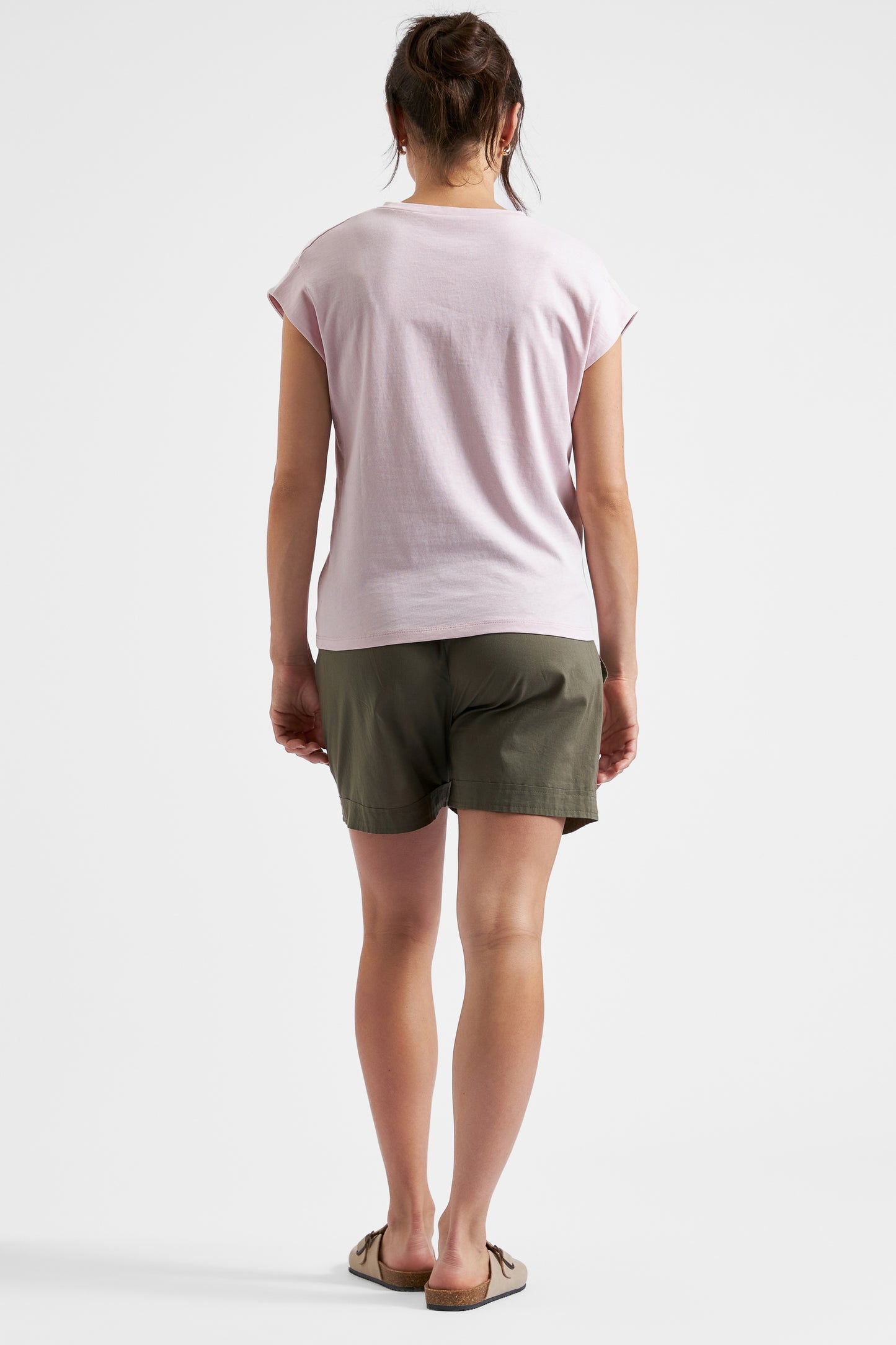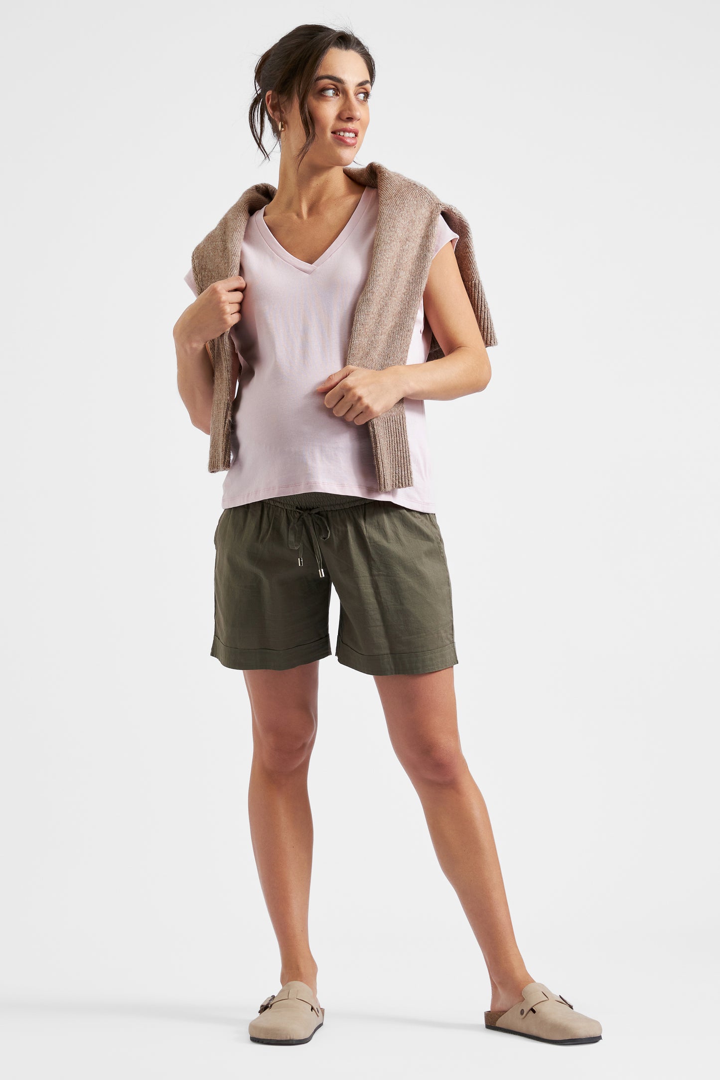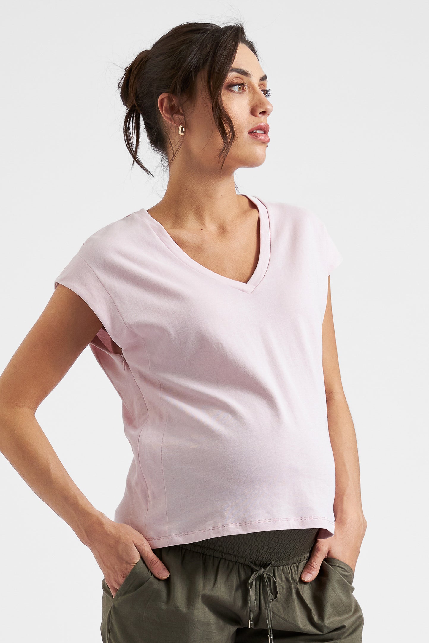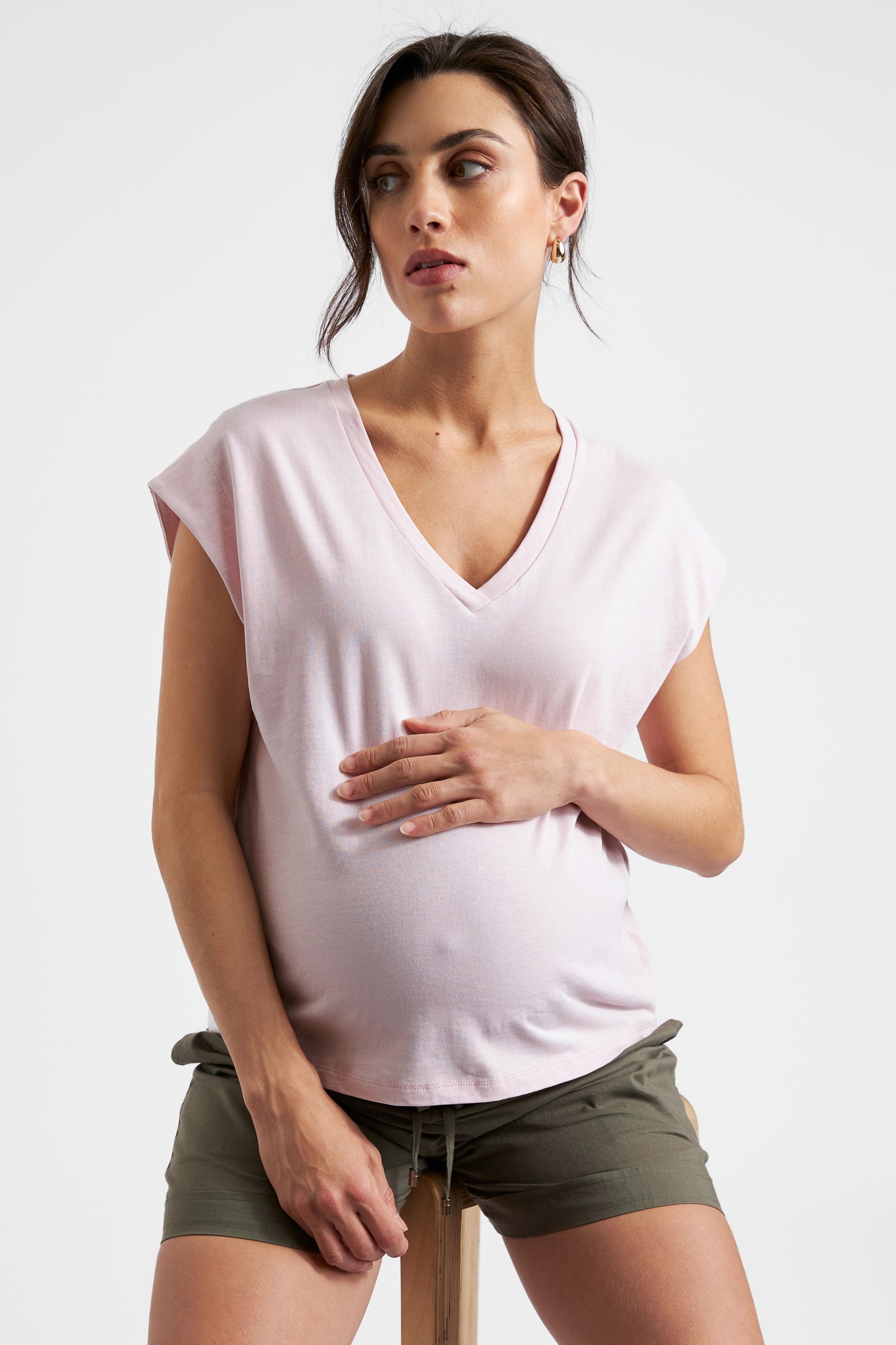 Roxy mit den blonden Haaren ist 174cm groß und trägt Gr. S. Studiomodel Sula ist 179cm groß und auf den Fotos in der 28. SSW. Sie trägt das Shirt in Gr. S.
