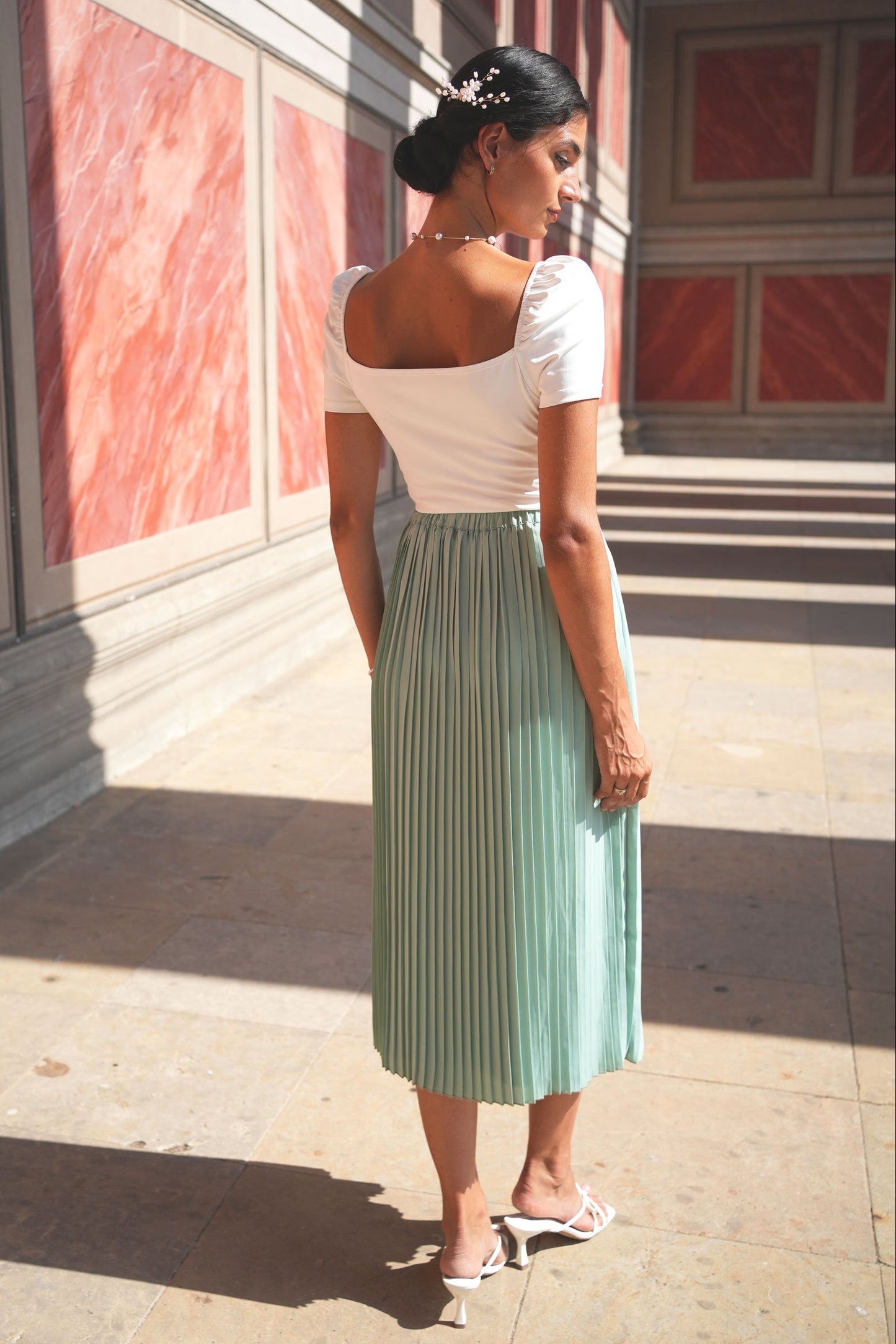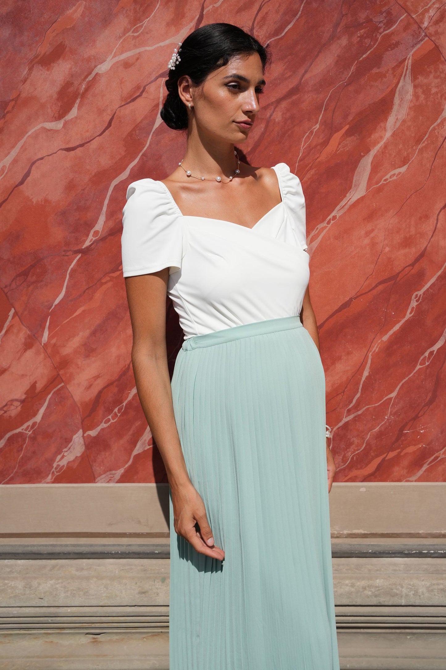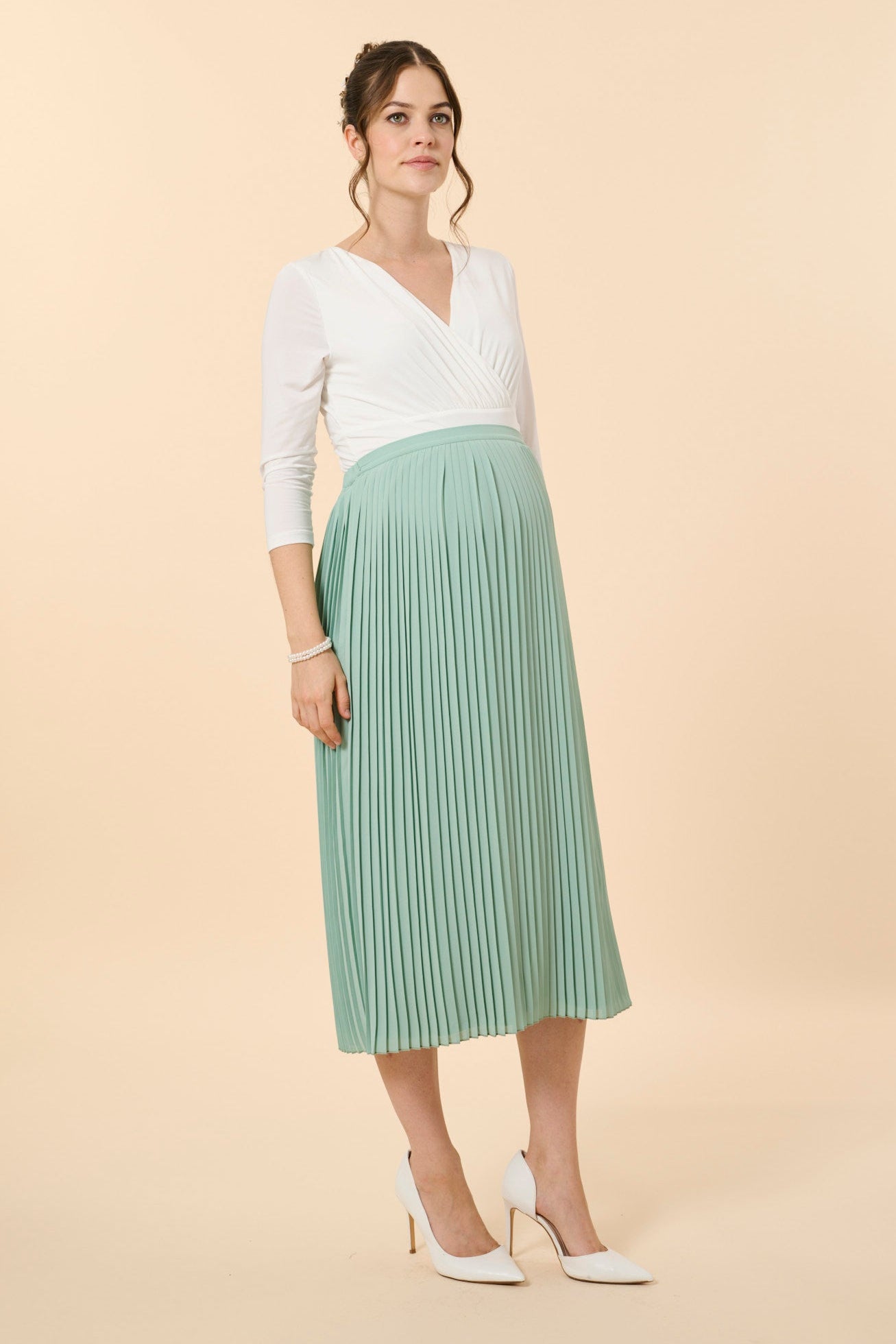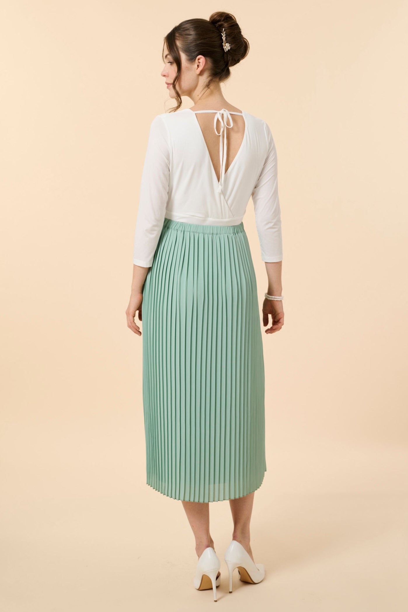 Umstandsbrautrock mit Plissees in Midi Länge. Die feinen Falten verleihen dem Rock eine fließende Struktur. Er lässt sich perfekt mit verschiedenen Brautoberteilen kombinieren und sorgt für einen modernen Look an deinem besonderen Tag. Als wunderschöner Hochzeits-Look: Kombiniere den Rock mit unserem Umstandsbody aus Spitze mit elegantem Rückendesign