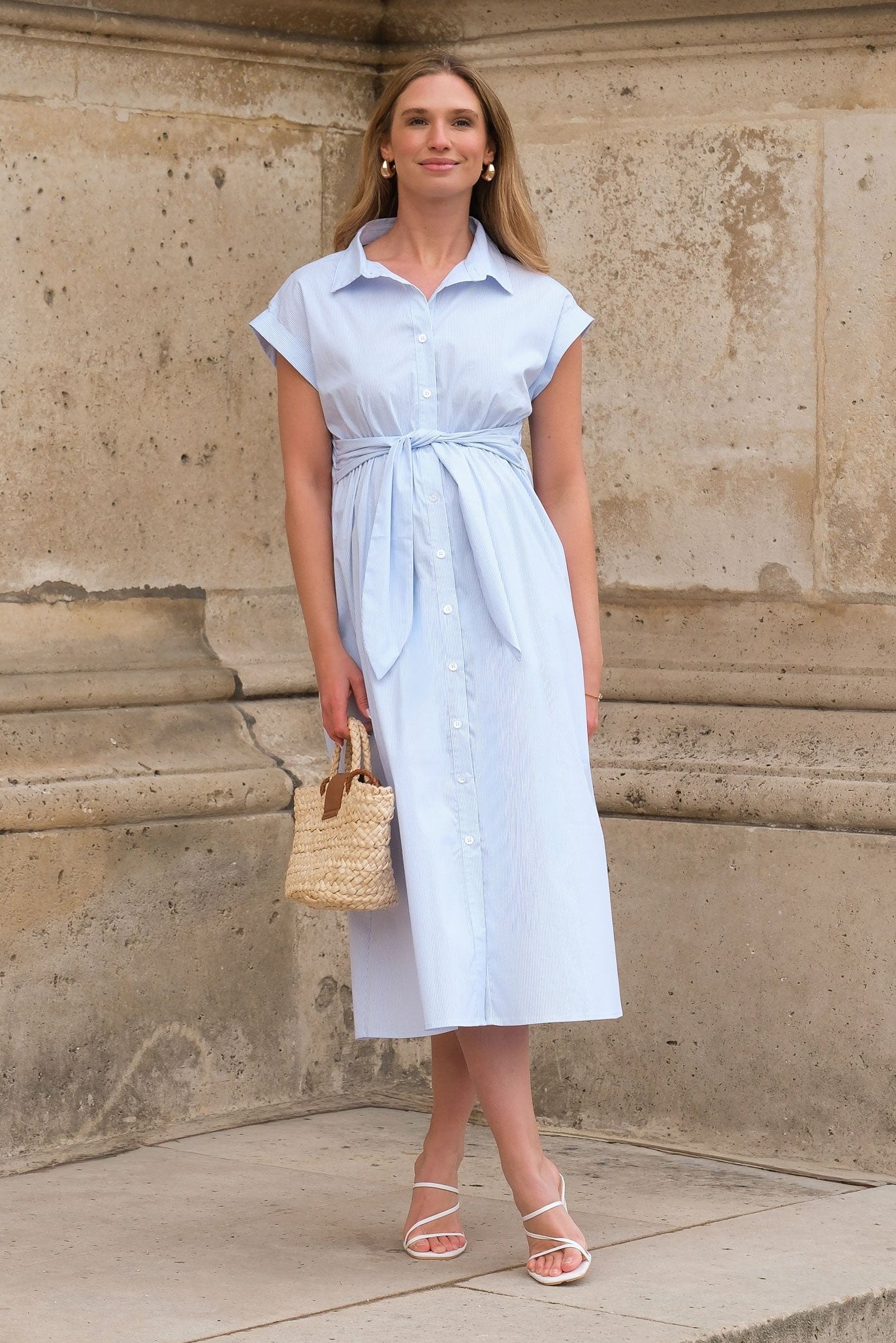 Midi langes Umstands- und Still-Hemdblusenkleid aus reiner Viskose mit Kragen und Knopfleiste. Mit den integrierten Bändern kannst du dein Outfit individuell stylen und deine Silhouette betonen. Nach der Geburt hast du einen diskreten Stillzugang über die Knopfleiste.