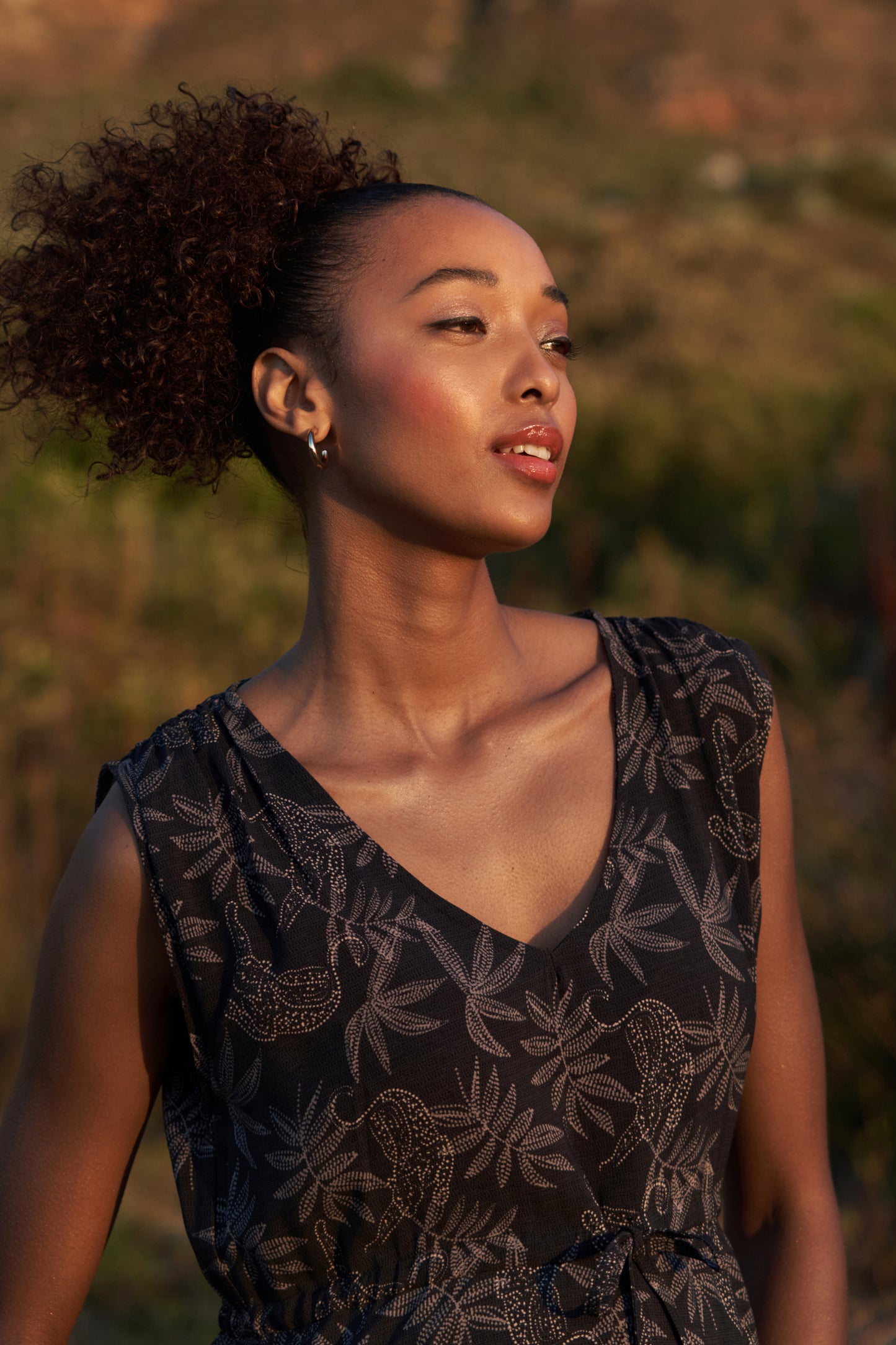 Ärmelloses Umstands- und Stillkleid aus weicher und elastischer Viskose mit Ginkgo Print, mit V-Ausschnitt und integriertem Bindegürtel. Durch diesen kannst du das Kleid flexibel an deine Silhouette anpassen, egal mit oder auch ohne Babybauch. Der schwingende Rockteil und der tiefe Rückenausschnitt machen das Kleid zu einem absolutem Sommer Favorite. Nach der Geburt erhältst du dank dem praktischen Cache-Coeur Ausschnitt einen schnellen und einfachen Stillzugang indem du die überlappenden Stofflagen beiseite schiebst.