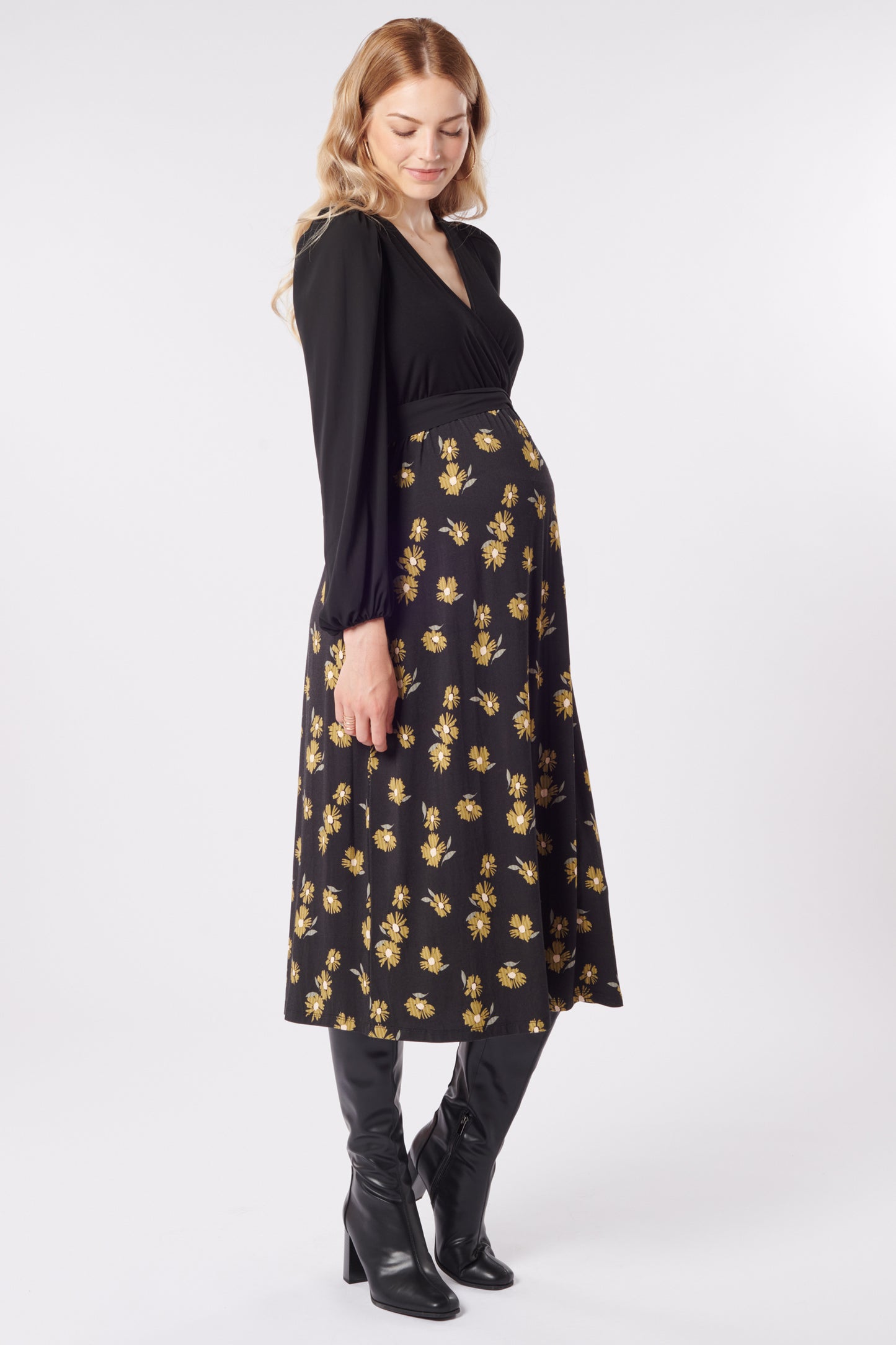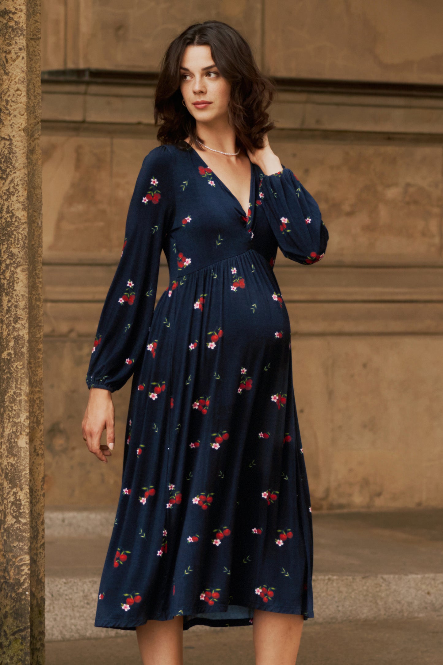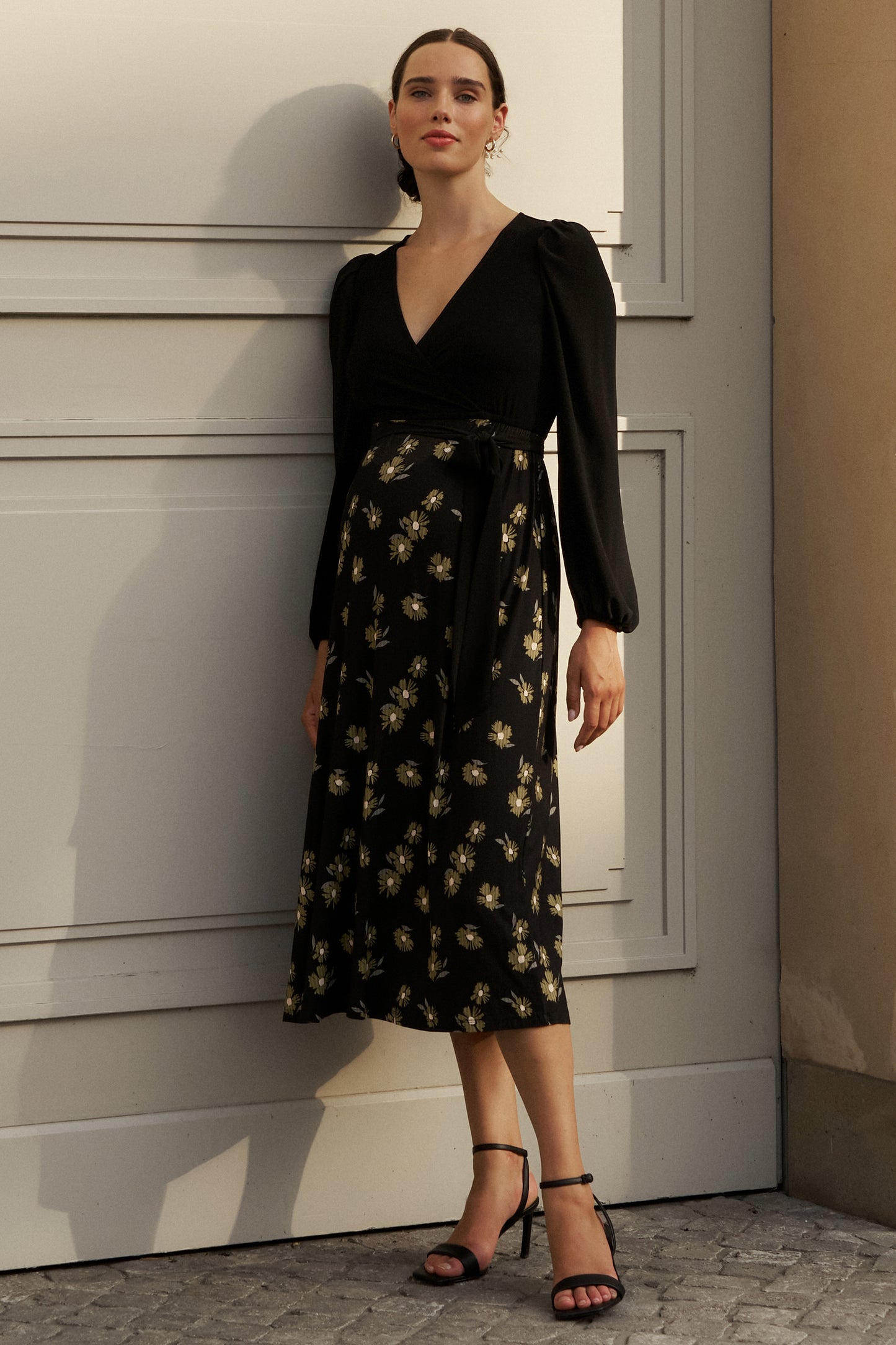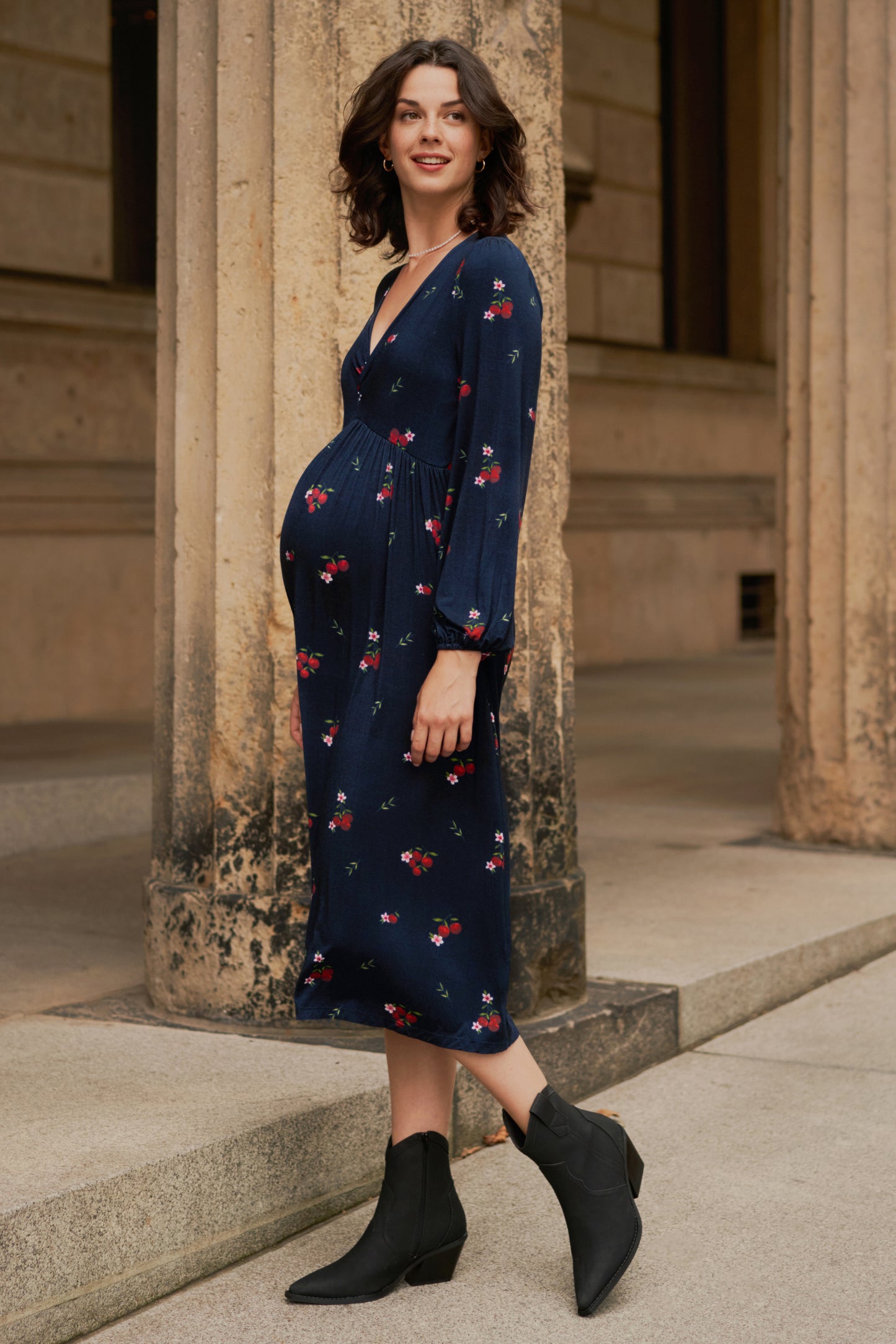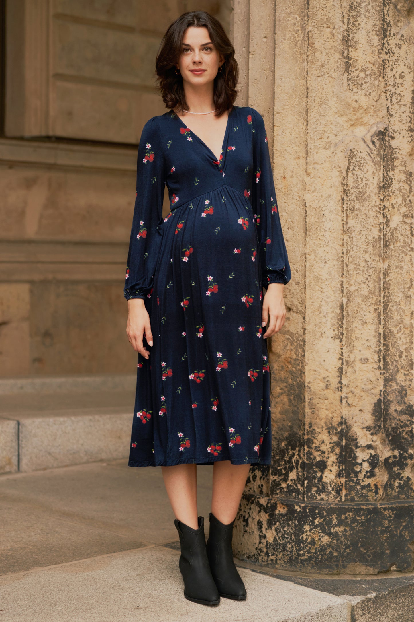 Umstands- und Stillkleid mit 3/4 Ärmeln, Oberteil aus weichem Jersey und schwingendem Rockteil aus reiner Viskose und mit Blumen Print. Das Oberteil schmiegt sich angenehm an deine Brust, während der Rock dank kleiner Raffungen locker über deinen Babybauch fällt. Für einen einfachen Stillzugang einfach die oberste Stofflage des Bustiers anheben und die darunter liegende, nach unten schieben. So wird deine Brust frei und du kannst dein Baby bequem darin stillen. Das Kleid ist durch den vorteilhaften Schnitt sowohl mit als auch ohne Babybauch geeignet.