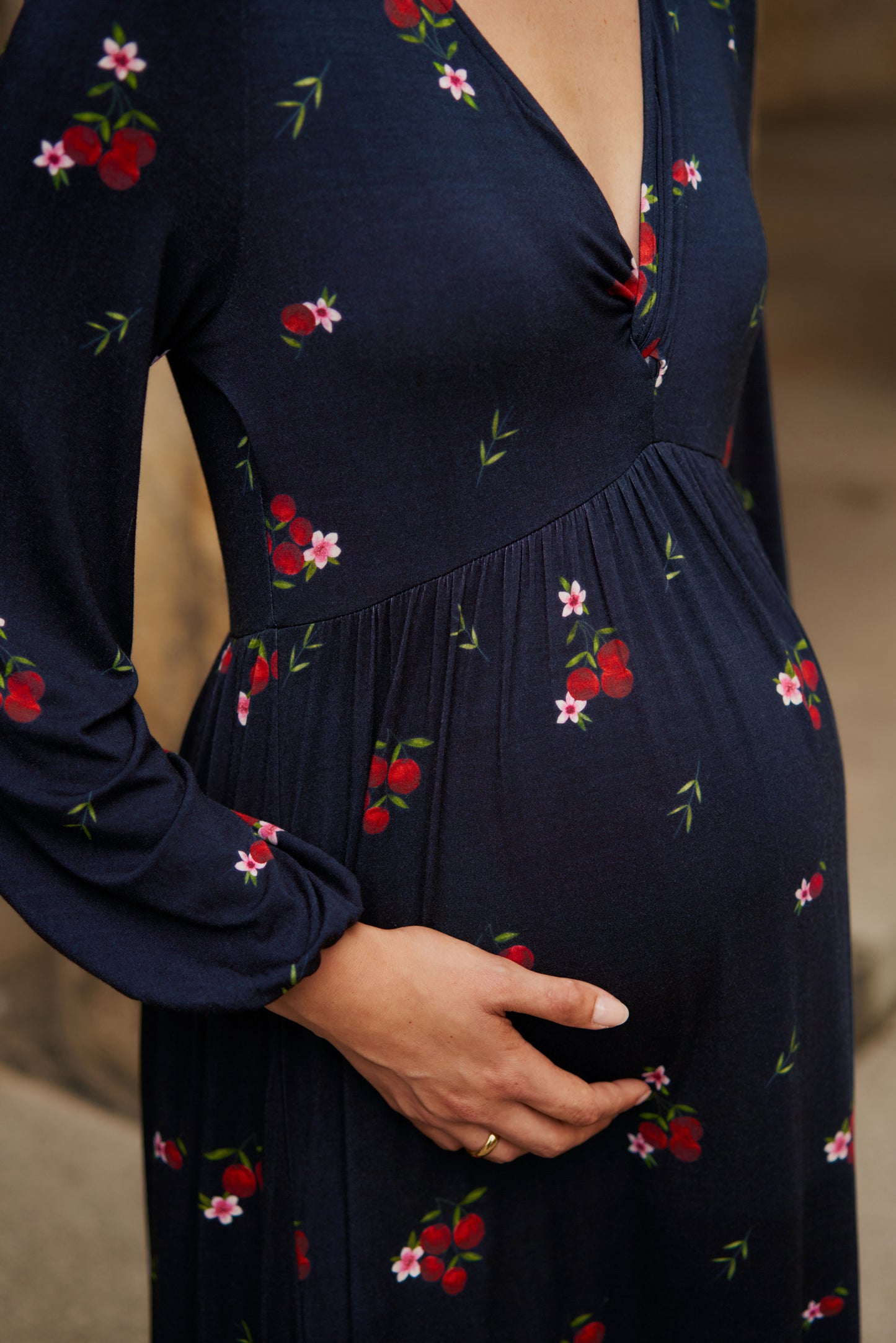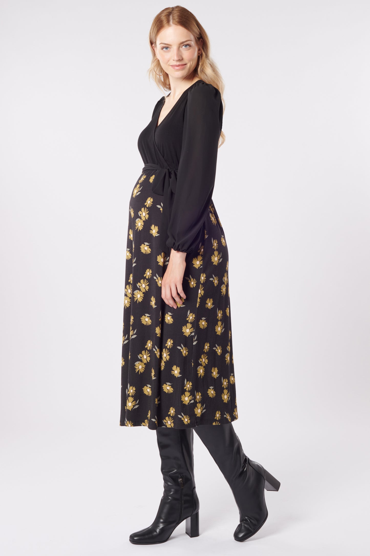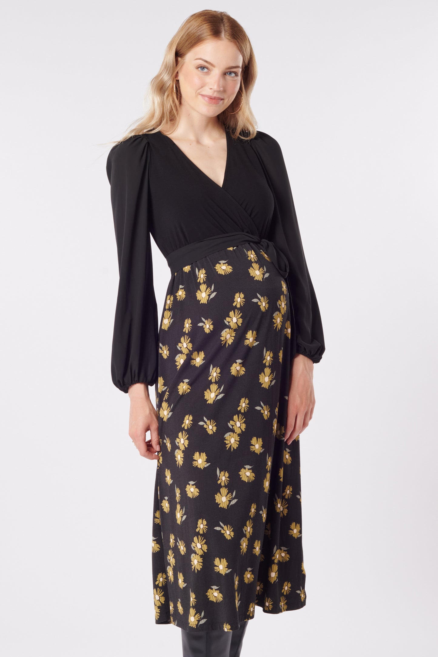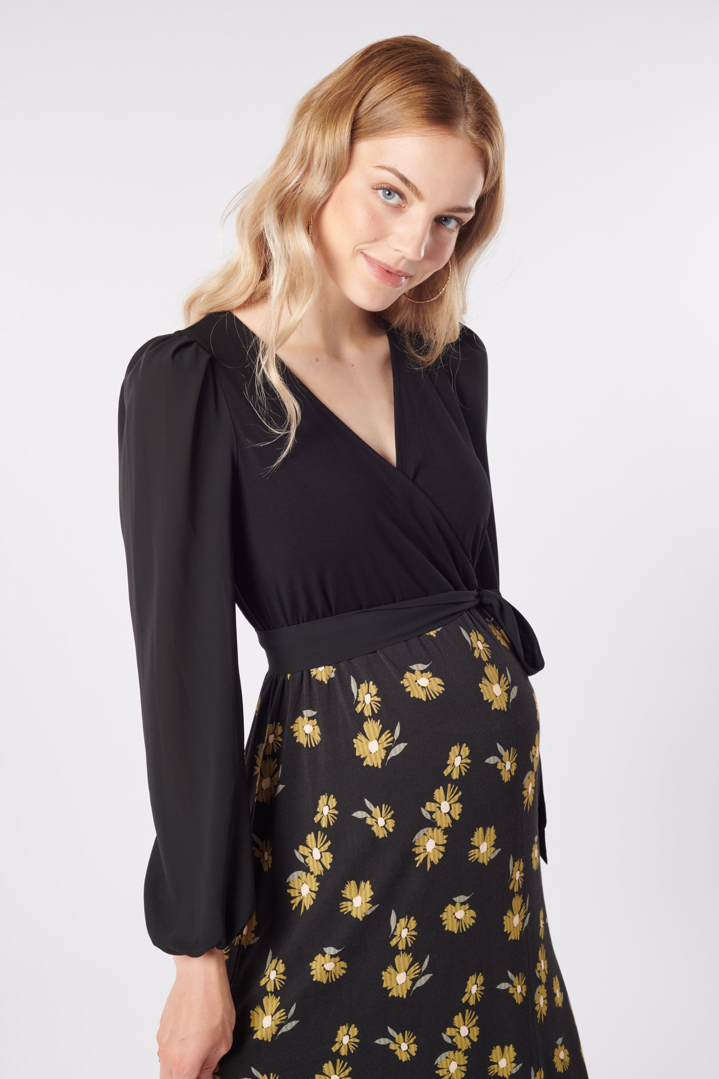 Umstands- und Stillkleid mit 3/4 Ärmeln, Oberteil aus weichem Jersey und schwingendem Rockteil aus reiner Viskose und mit Blumen Print. Das Oberteil schmiegt sich angenehm an deine Brust, während der Rock dank kleiner Raffungen locker über deinen Babybauch fällt. Für einen einfachen Stillzugang einfach die oberste Stofflage des Bustiers anheben und die darunter liegende, nach unten schieben. So wird deine Brust frei und du kannst dein Baby bequem darin stillen. Das Kleid ist durch den vorteilhaften Schnitt sowohl mit als auch ohne Babybauch geeignet.