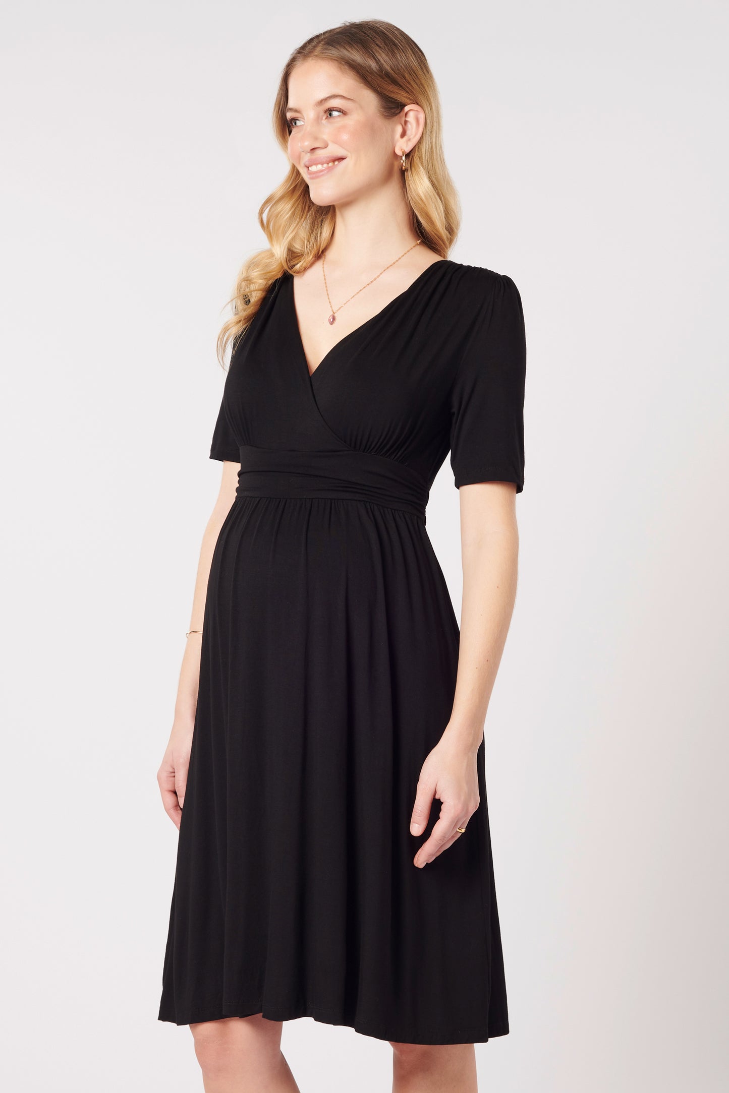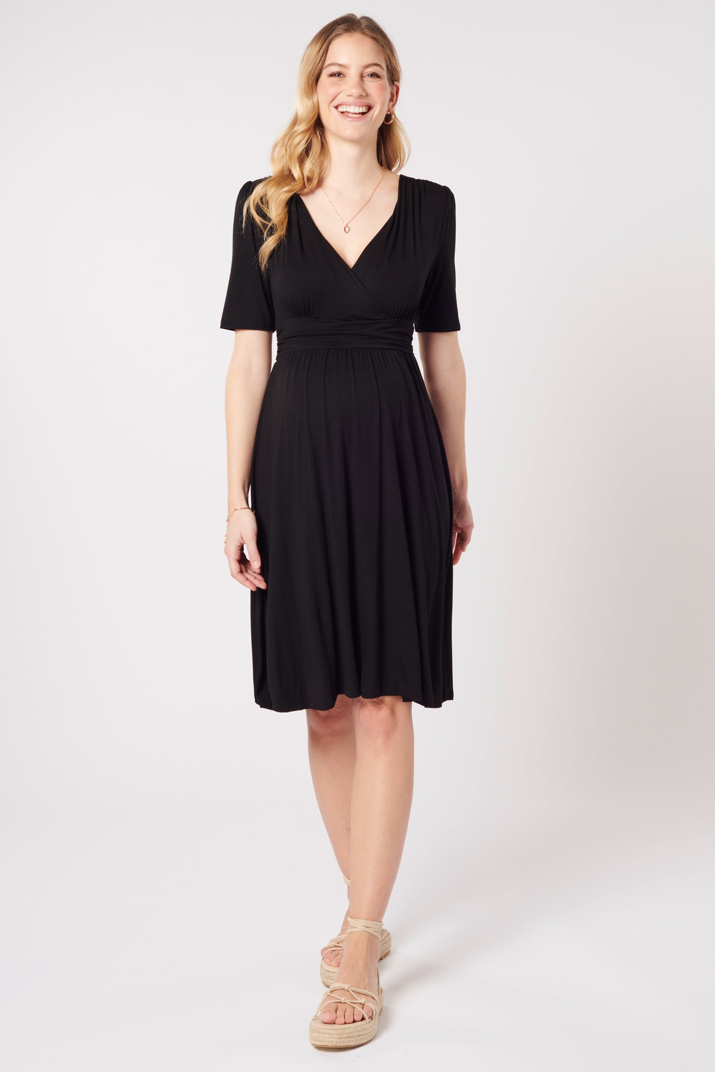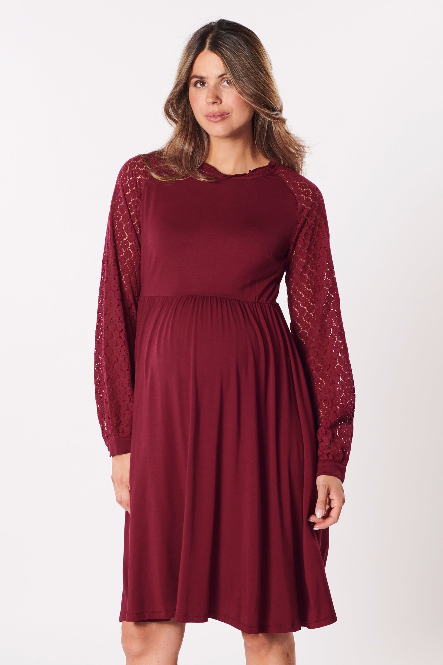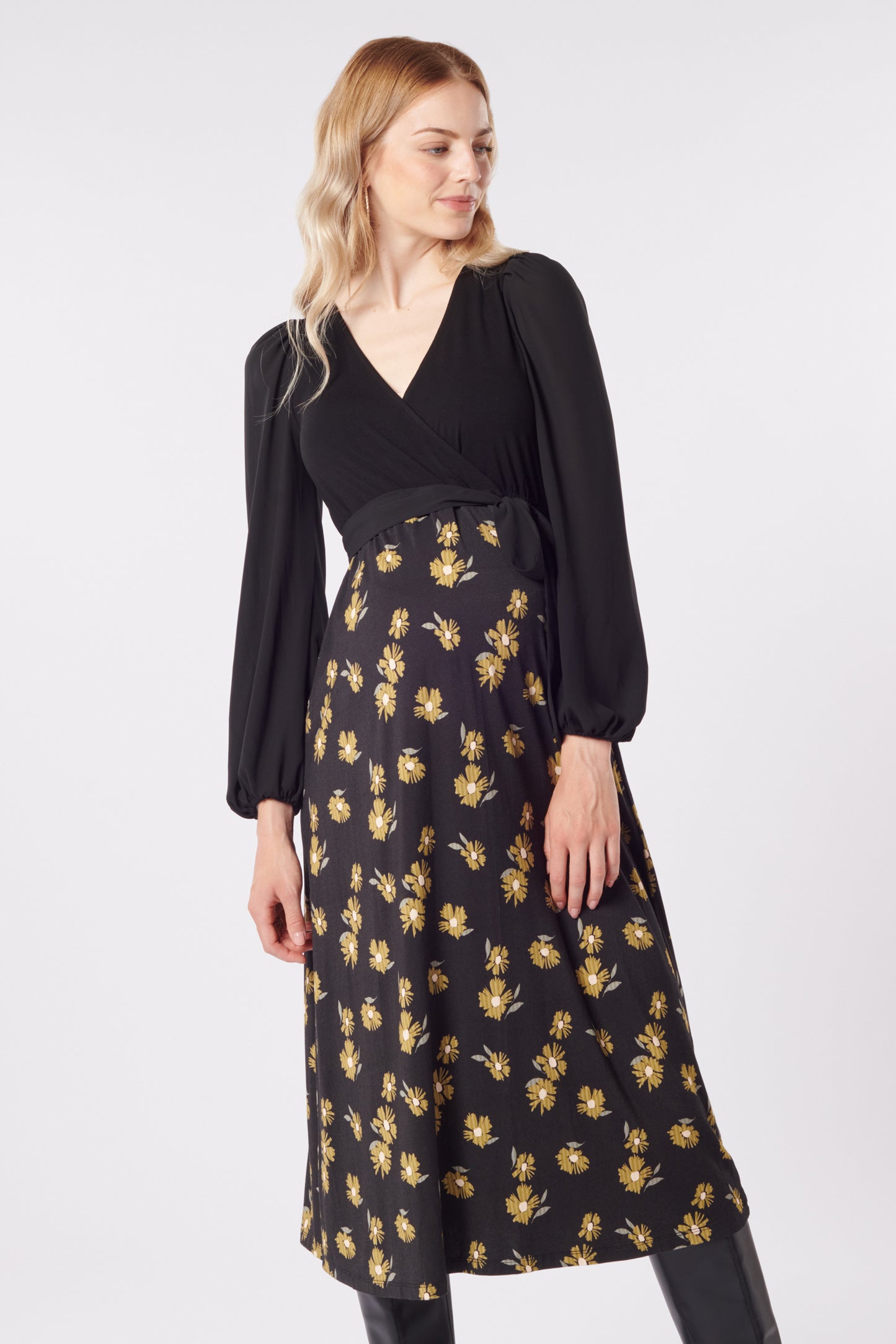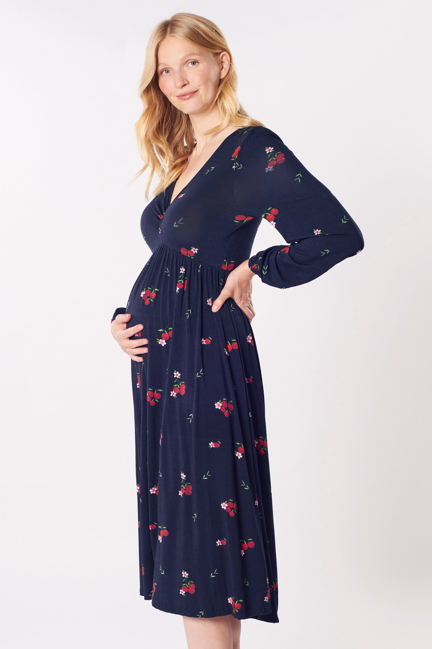 Umstands- und Stillkleid mit 3/4 Ärmeln, Oberteil aus weichem Jersey und schwingendem Rockteil aus reiner Viskose und mit Blumen Print. Das Oberteil schmiegt sich angenehm an deine Brust, während der Rock dank kleiner Raffungen locker über deinen Babybauch fällt. Für einen einfachen Stillzugang einfach die oberste Stofflage des Bustiers anheben und die darunter liegende, nach unten schieben. So wird deine Brust frei und du kannst dein Baby bequem darin stillen. Das Kleid ist durch den vorteilhaften Schnitt sowohl mit als auch ohne Babybauch geeignet.