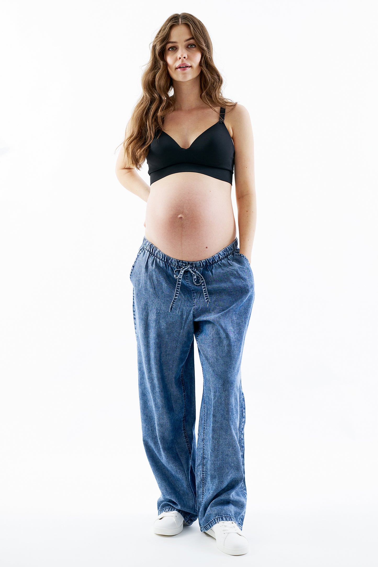 Der weite Beinverlauf sorgt für eine lässige Passform, während seitliche Eingrifftaschen und aufgesetzte Gesäßtaschen den Look einer klassischen Jeans aufgreifen. Die Jeans wirkt wie eine normale Wide-Leg-Jeans, bietet aber den Komfort und die Schnittführung, die während der Schwangerschaft entscheidend ist.