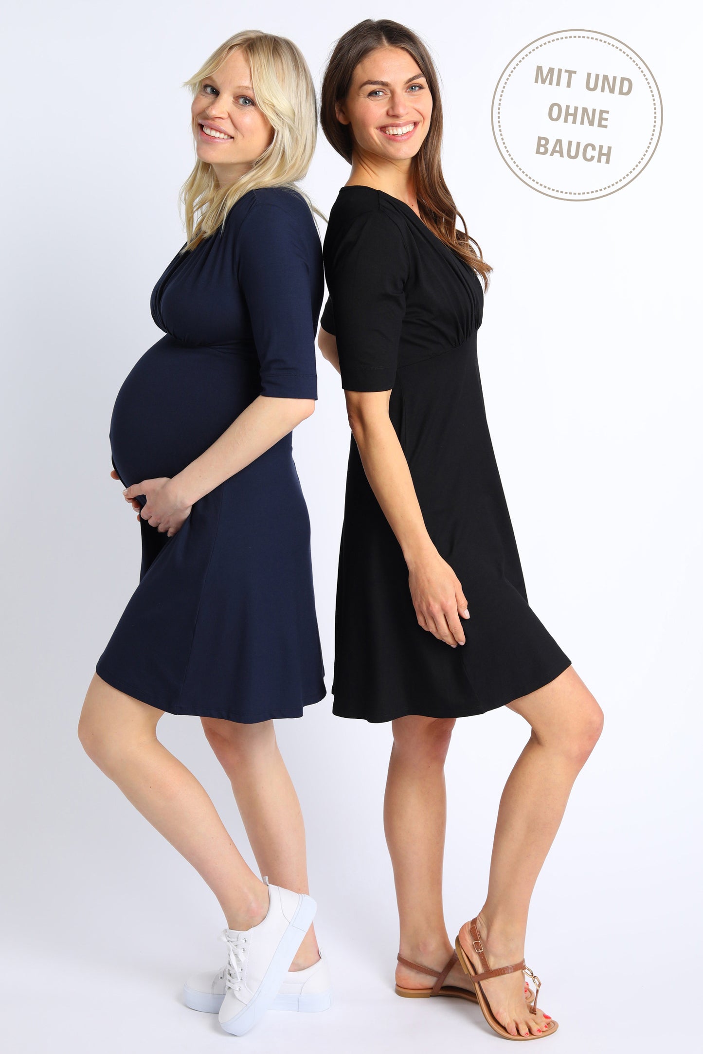 Umstands- und Stillkleid mit passendem Post Partum Shaping Top (für die Zeit nach der Geburt) im Set. Das softe Kleid mit halblangen Ärmeln und Cross-Over Ausschnitt fällt während der Schwangerschaft wunderschön über deinen Babybauch. Eine elastische Naht unter der Brust betont dabei die Taille und sorgt so für eine tolle Silhouette.