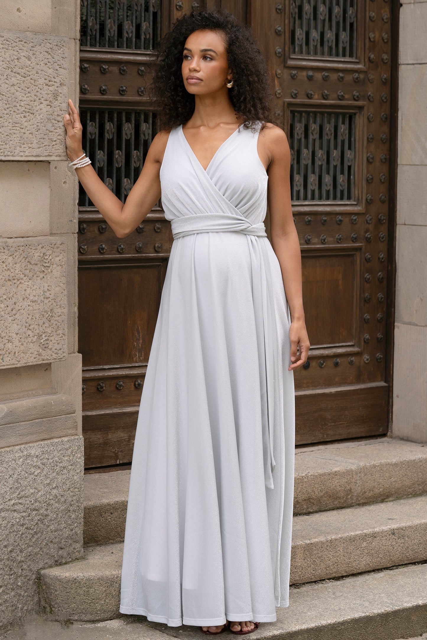 Lange Umstands- und Stillrobe aus leicht schimmerndem Lurex-Jersey. Der Stoff fällt fließend und sorgt für einen eleganten Glanz, der das Kleid perfekt für festliche Anlässe macht. Der Taillengürtel aus demselben Material betont die Figur und sorgt für eine schöne Silhouette. Der lange Rock umspielt sanft den Babybauch und bietet hohen Tragekomfort – auch lange nach der Schwangerschaft.