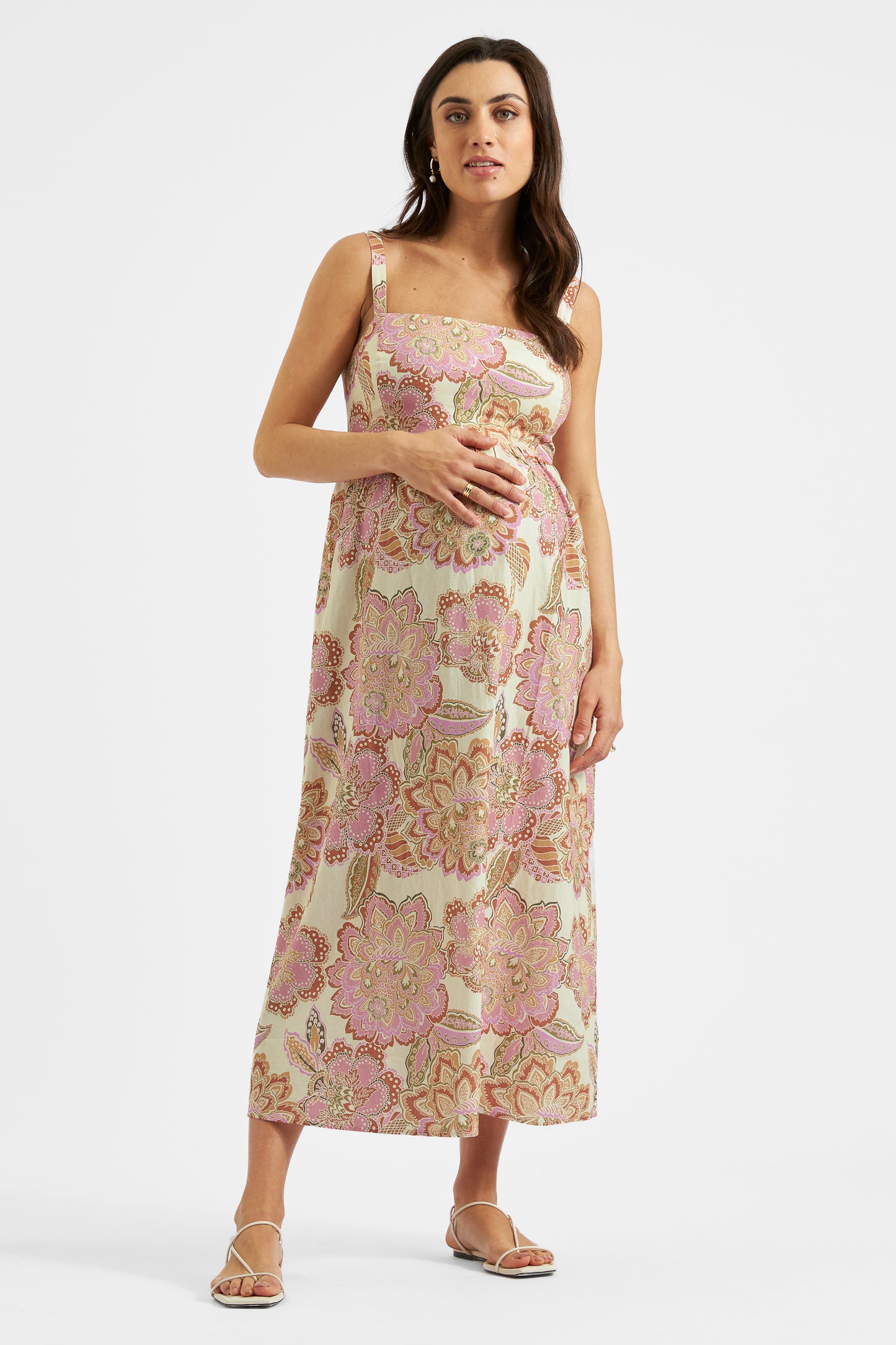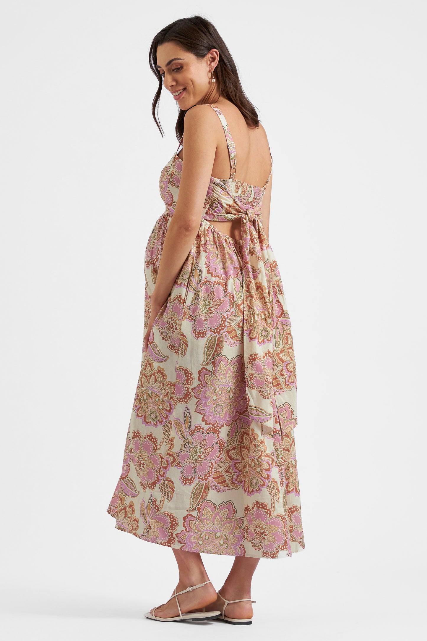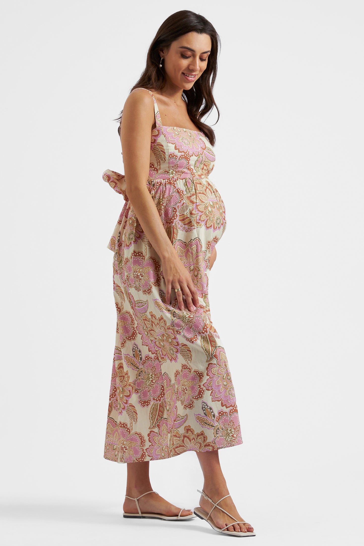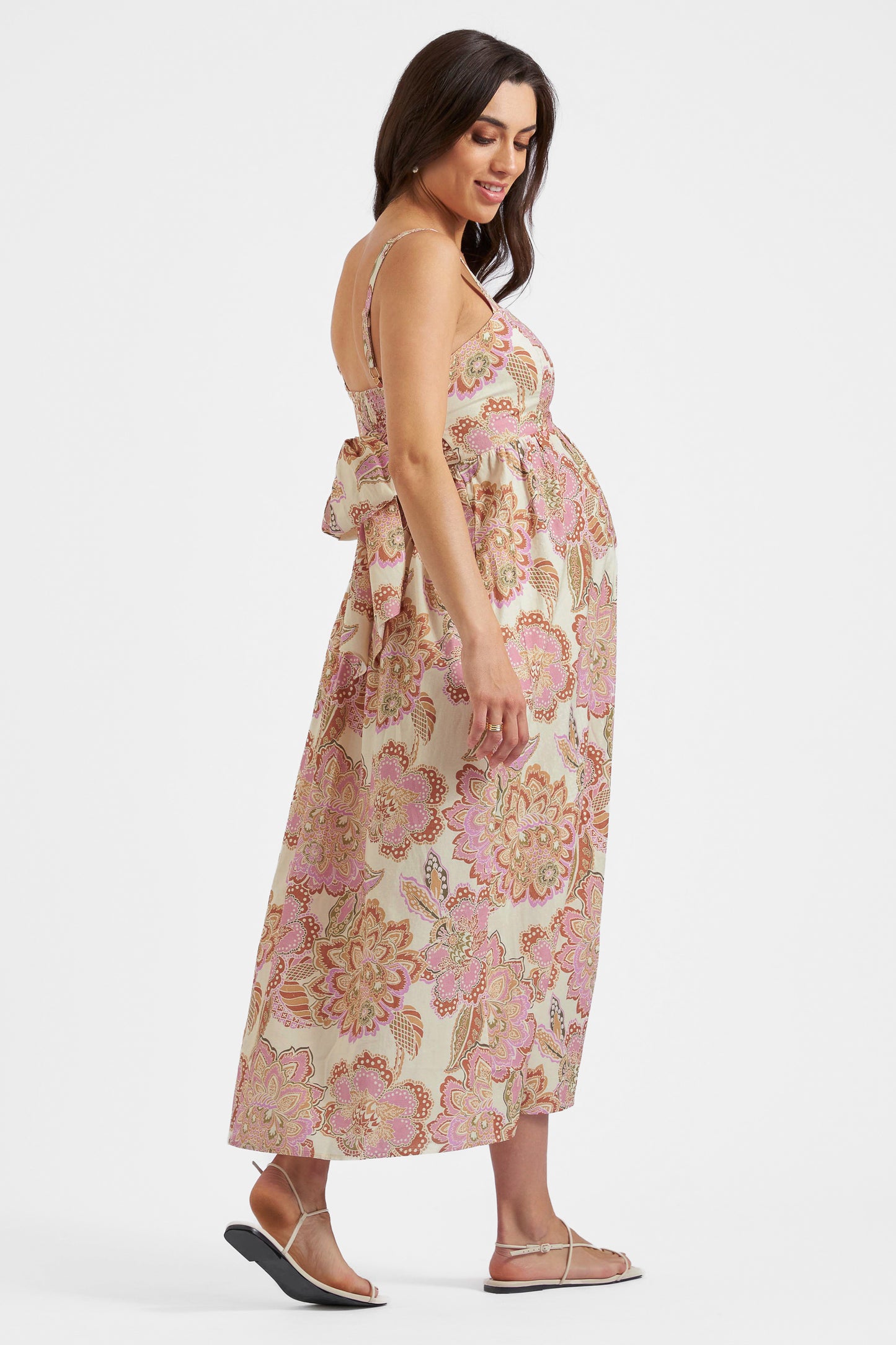 Maxi Umstands-und Stillkleid aus weicher und nachhaltiger Ecovero Viskose, mit Knotendetail und kurzen, überschnittenen Ärmeln. Das Kleid ist in eleganter Maxi Länge mit betonter Taille. Das elastische Material passt sich deiner veränderten Silhouette ideal an, egal mit oder ohne Babybauch. Der tiefe V-Ausschnitt mit raffiniertem Knotendetail betont besonders schön dein Dekolleté. Nach der Geburt erhältst du über den elastischen Ausschnitt einen einfachen Stillzugang.