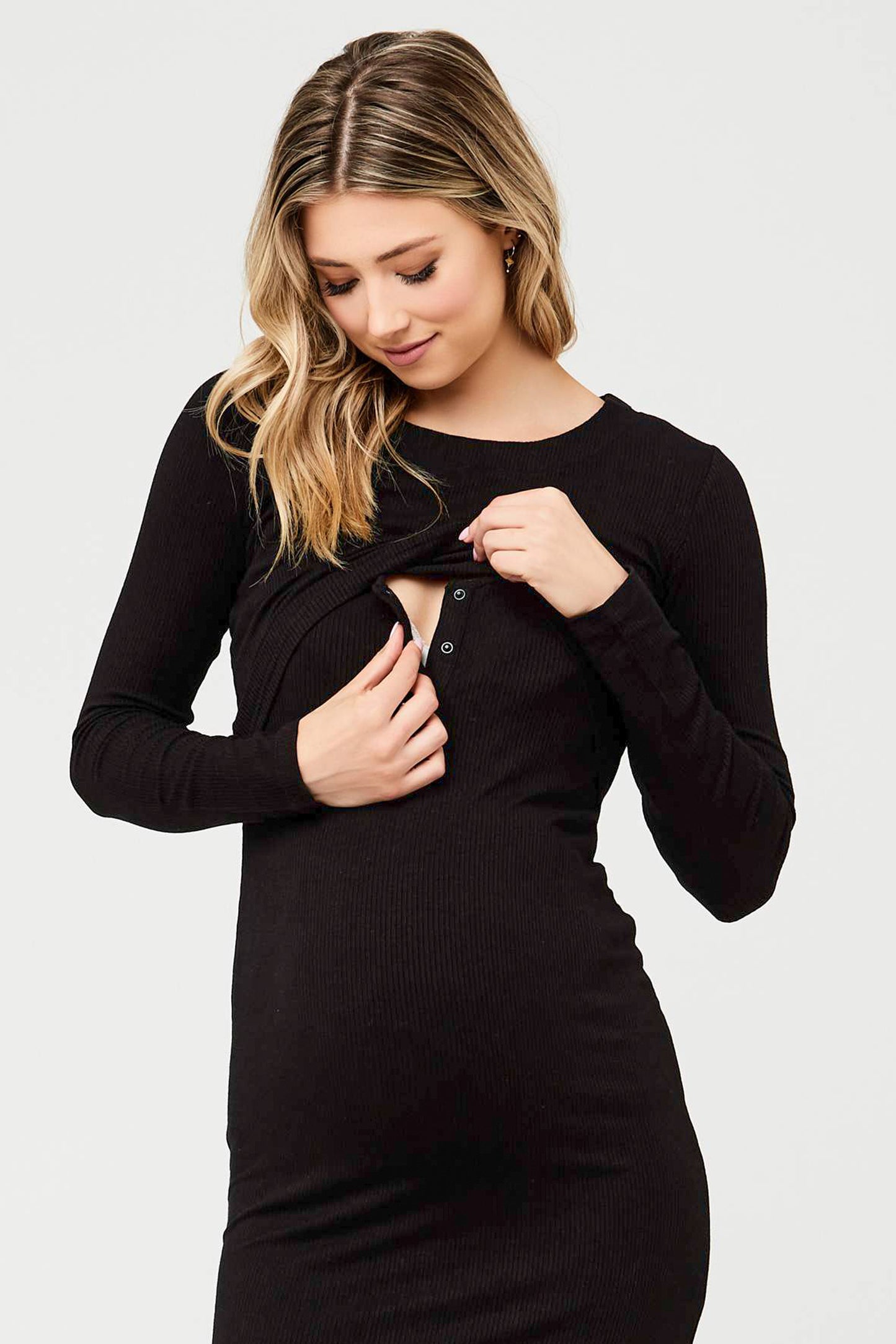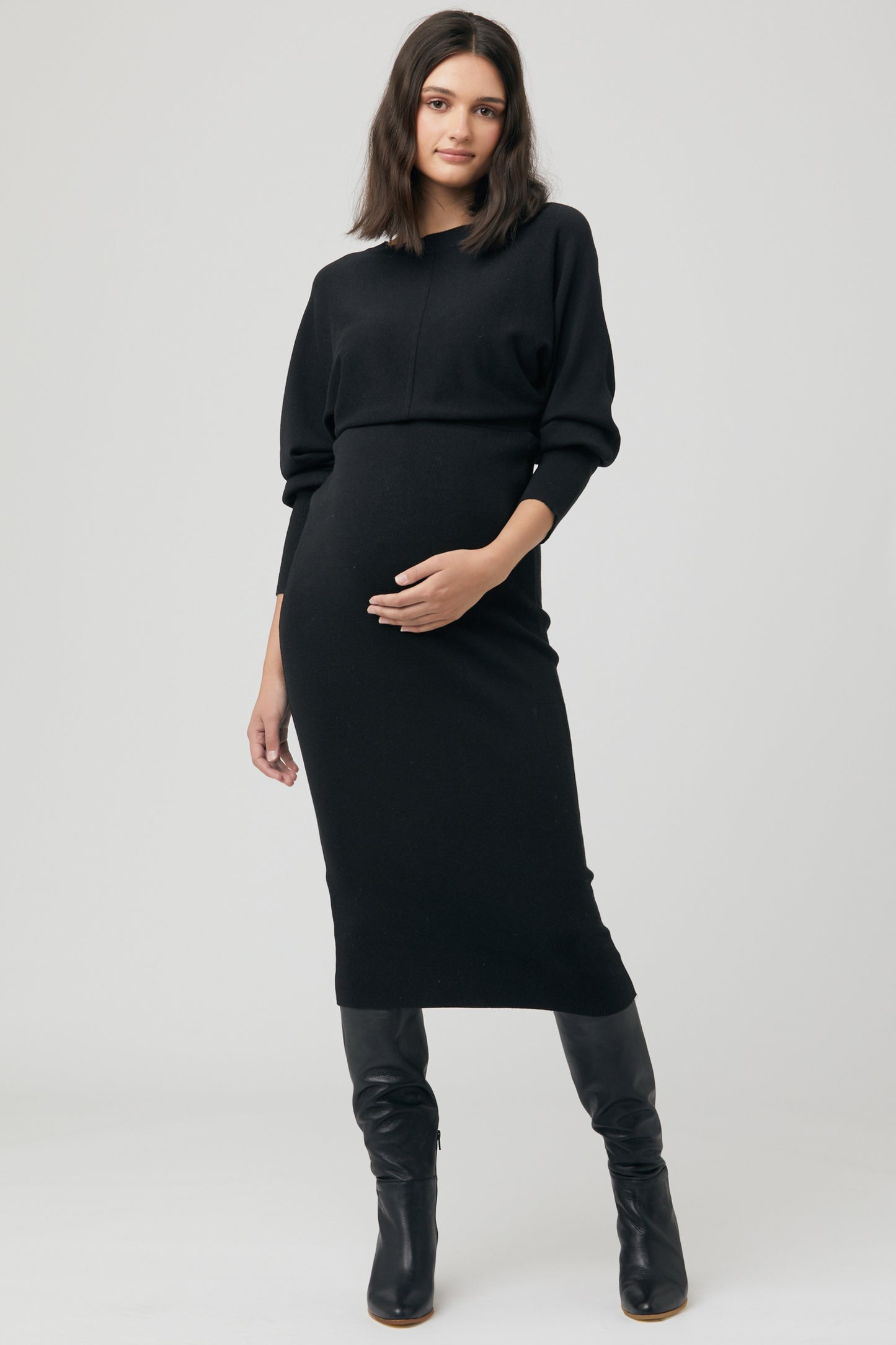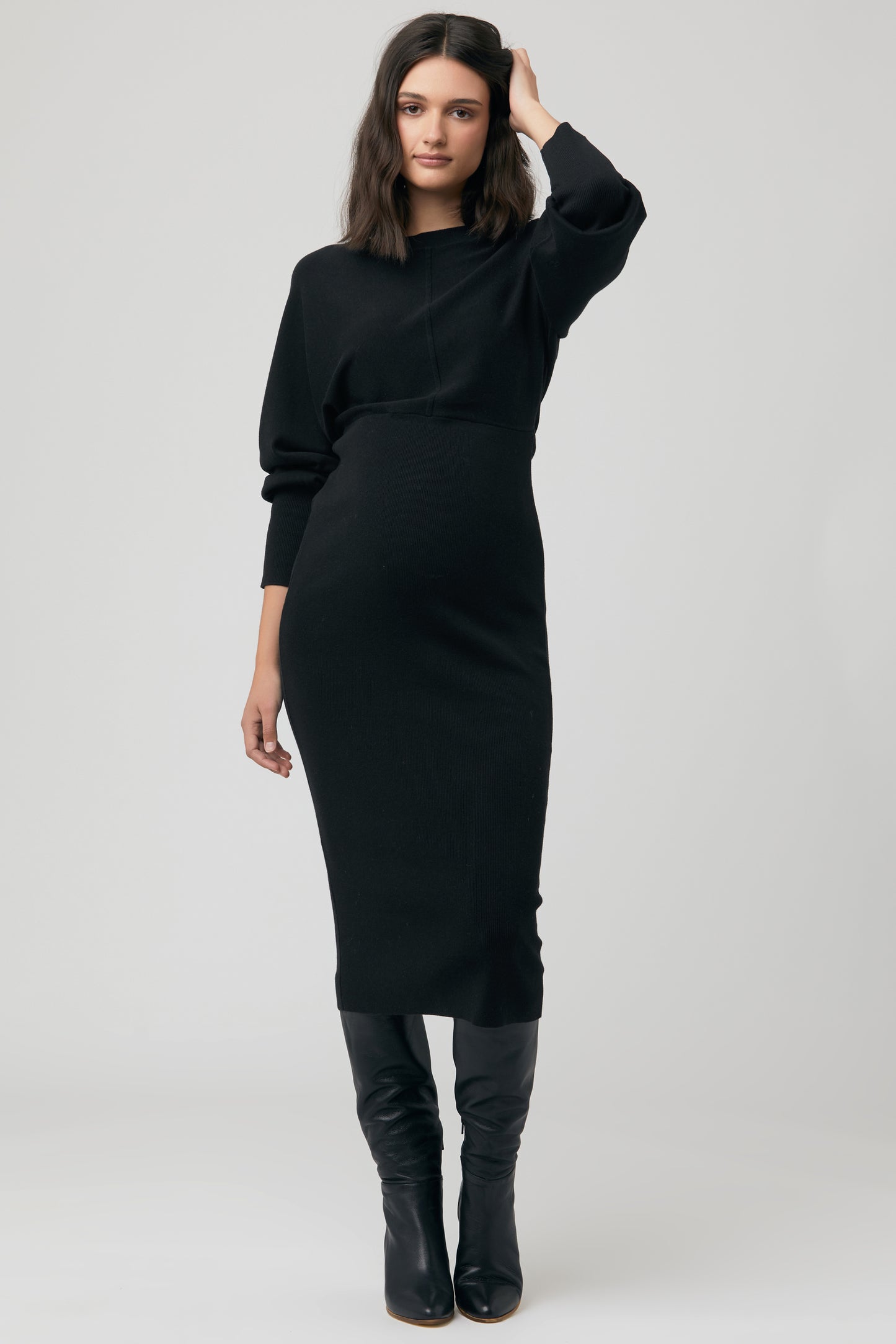 Umstands- und Stillstrickkleid mit figurbetontem Schnitt und Batwingärmeln. Der Reißverschluss am Ausschnitt ermöglicht einen diskreten Stillzugang
