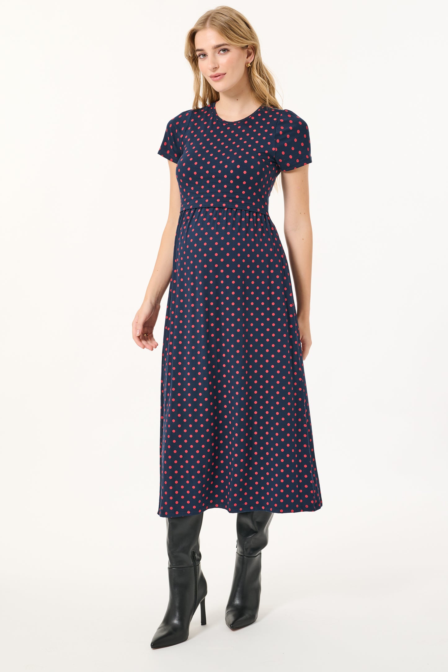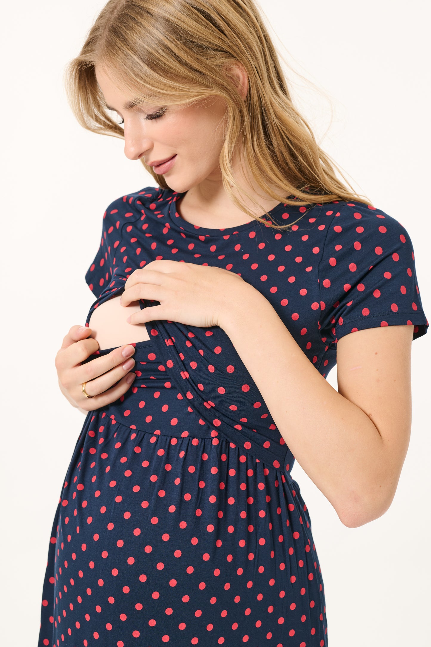 Maternity and nursing dress with polka dots, made from comfortable, sustainable eco-viscose fabric in a midi length. The lift-up nursing opening allows for discreet access during breastfeeding.