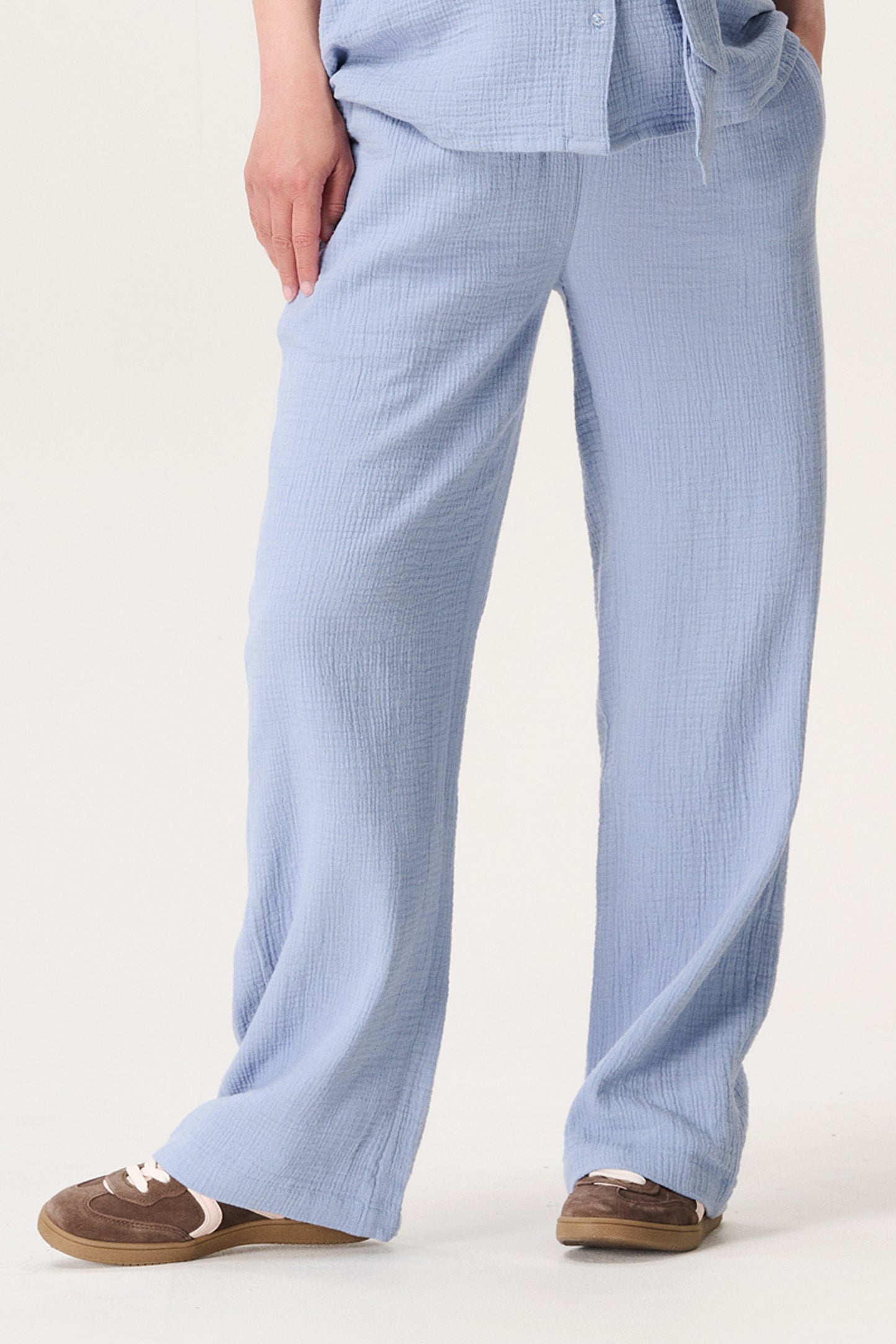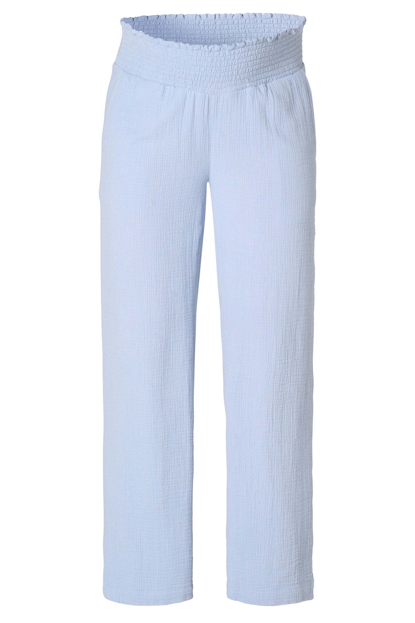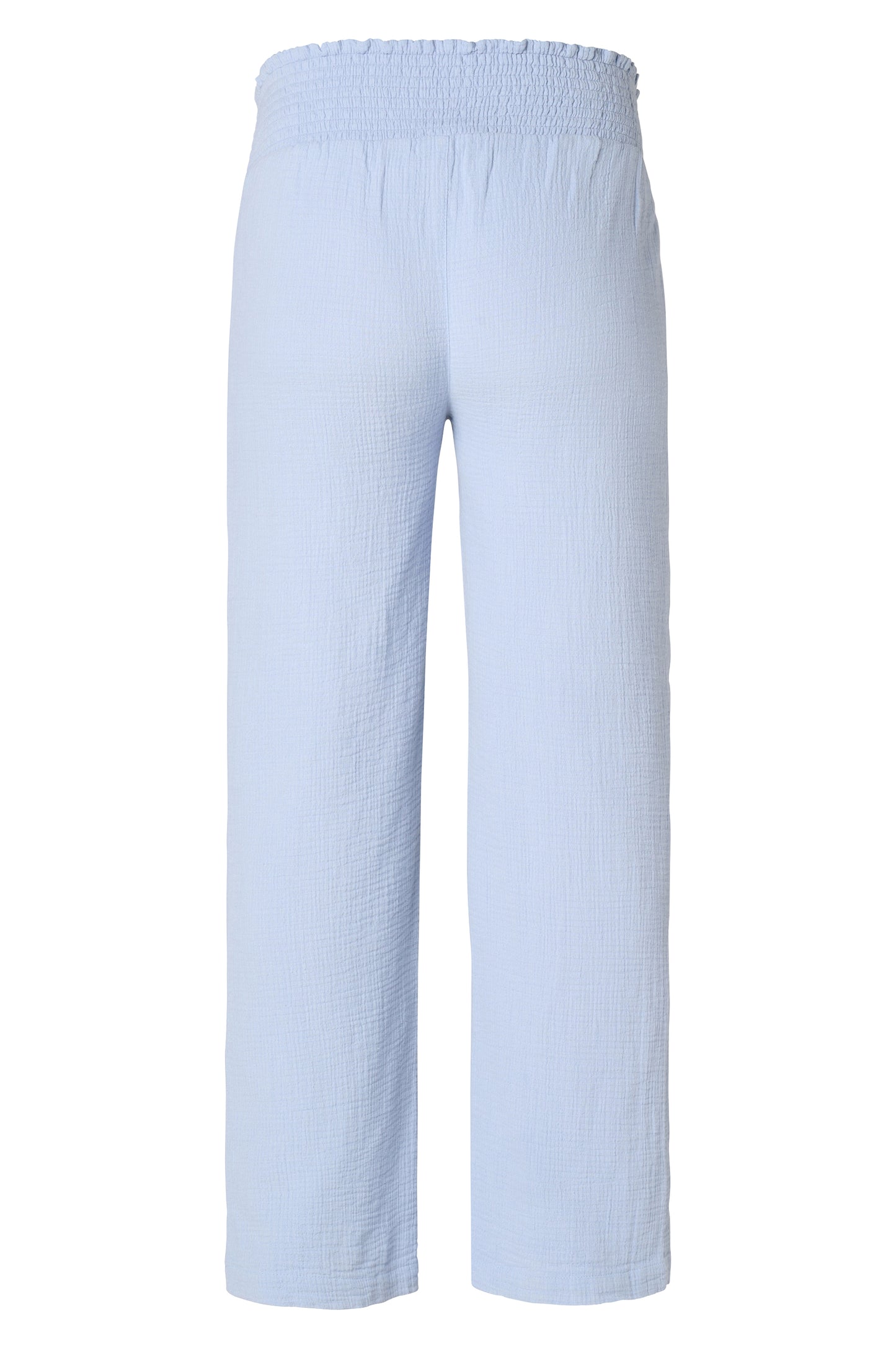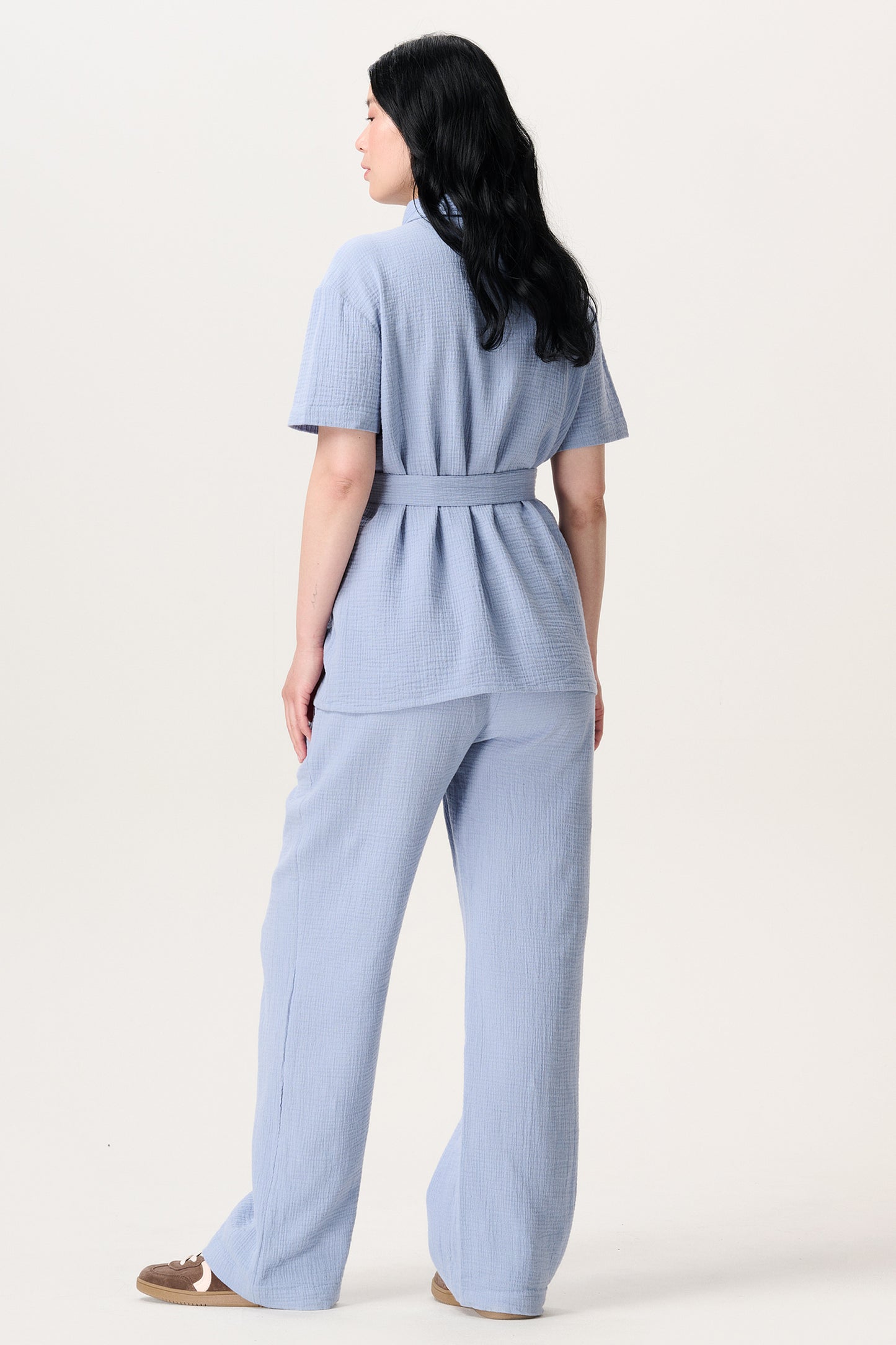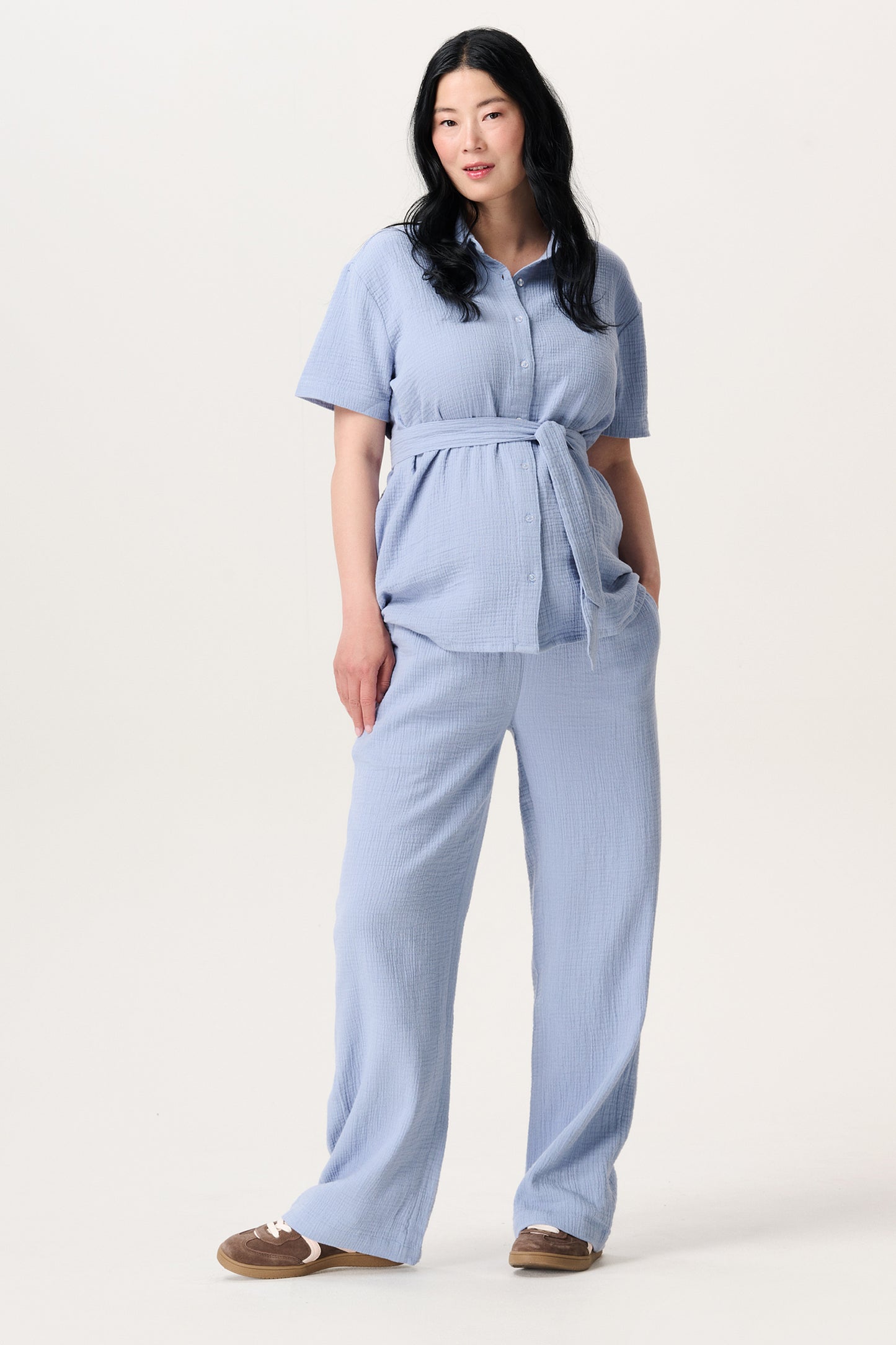 This muslin blouse with a tie belt has a relaxed fit and its design offers ample room for a growing belly. The tie belt is knotted above the waist, allowing for individual adjustment without restricting movement. This makes it possible to vary the fit depending on body shape and stage of pregnancy.