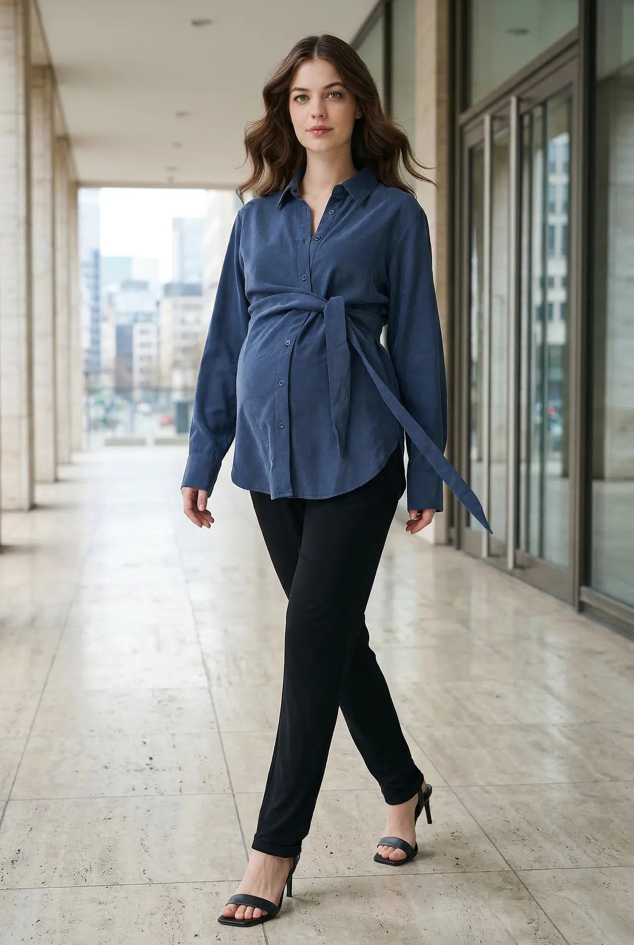 A wide tie belt at the waist allows for individual adjustment and accentuates the figure above the belly. The button placket provides easy access for breastfeeding. The long sleeves are finished with cuffs. The blouse can also be worn after pregnancy.