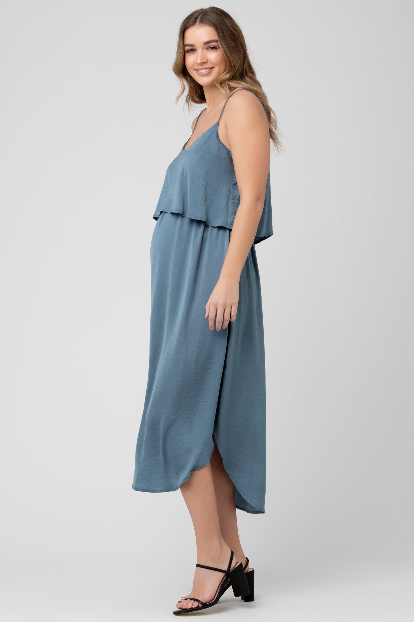 A midi-length maternity and nursing dress with side slits and a rounded hem. The bustier top can be easily lifted for quick access to your breast. This dress is ideal for pregnancy, breastfeeding, and beyond.