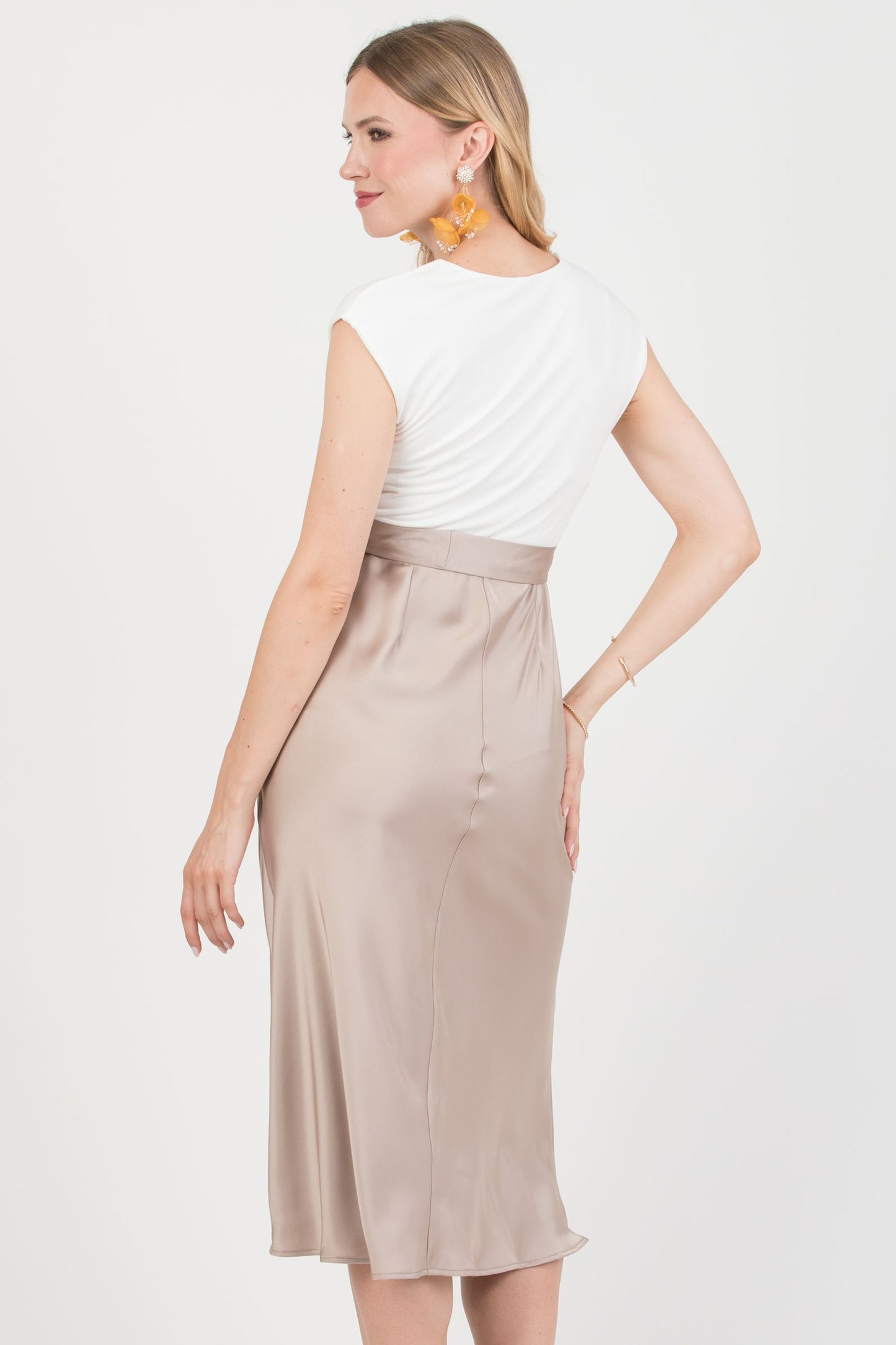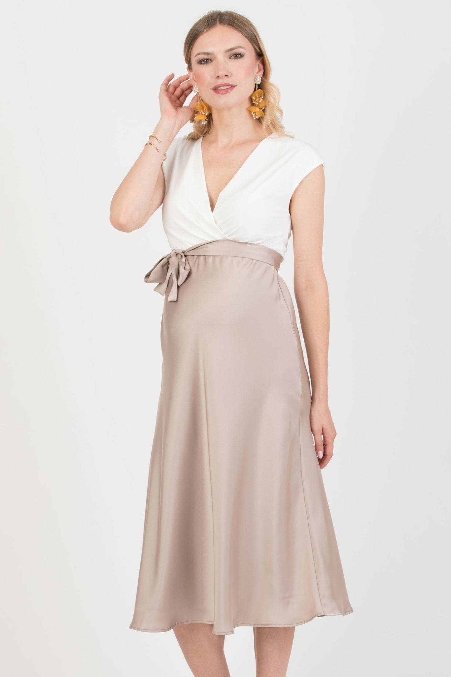 Dieses Umstands- und Stillkleid im Material-Mix verbindet ein weiches Jersey Oberteil mit einem edel schimmernden Satinrock. Der Wickelausschnitt mit Kimonoärmeln ermöglicht einen diskreten Stillzugang, während der Rock die Silhouette fließend umspielt. Ein elegantes Kleid für Schwangerschaft, Stillzeit und festliche Momente.