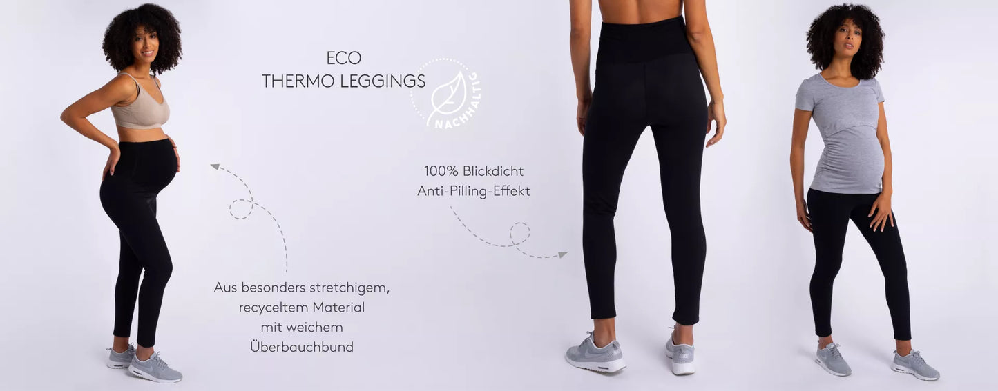 Ganz wichtig: Kleidung und Produkte aus wiederaufbereiteten Fasern sind nicht etwa qualitativ schlechter als Artikel aus neuen Materialien. Du kannst den Unterschied weder sehen noch spüren. Im Gegenteil, oftmals sind Eco Kleider, Jacken und Taschen sogar besonders robust. Unsere Lieblings-Recycling-Produkt ist zum Beispiel unsere Eco Thermo Umstandsleggings aus super stretchigem Stoff. Sie besteht nicht nur aus über 80% wiederaufbereitetem Polyamid, ihre besondere Material-Zusammenstellung macht sie außerdem besonders formbeständig und wirkt antibakteriell. Zudem hat er einen Anti-Pilling-Effekt, der dich vor lästigen Fusseln bewahrt. Nicht zuletzt hält sie dich und deinen Babybauch an kalten Tagen auch mollig warm.