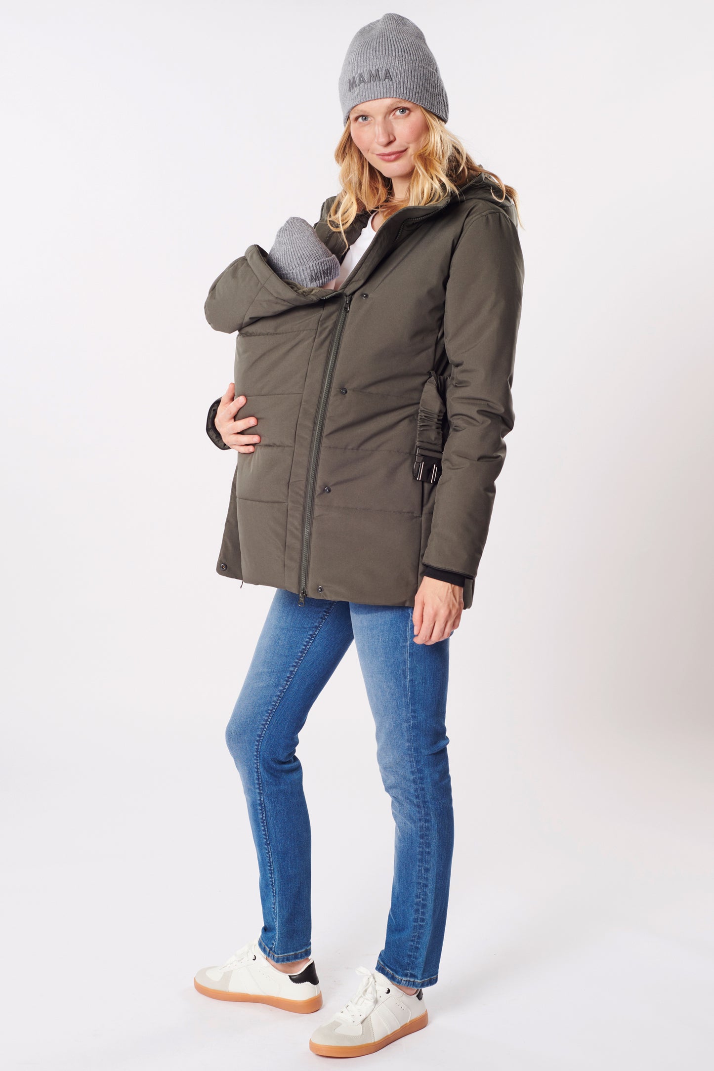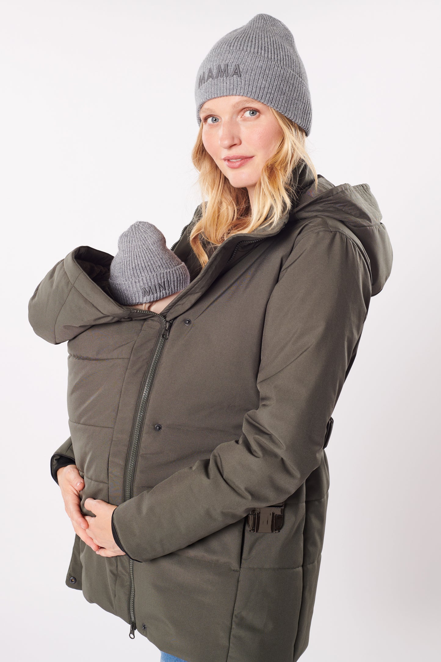 Nachhaltiger Umstandsmantel aus recyceltem Material, welcher als Tragejacke und Weste umfunktioniert werden kann. Der leicht gepuffte Mantel kann durch den Tunnelzug flexibel an deinen sich verändernden Babybauch angepasst werden. Die langen Ärmel können ganz einfach über den versteckten, integrierten Reißverschluss abgenommen werden. Mit im Lieferumfang befindet sich ein Babytrageeinsatz, welchen du nach der Geburt über den Reißverchluss einzippen kannst. Zusätzlich ist der Mantel wasserabweisend und verfügt über eine Kapuze, ideal für die Übergangsmonate.
