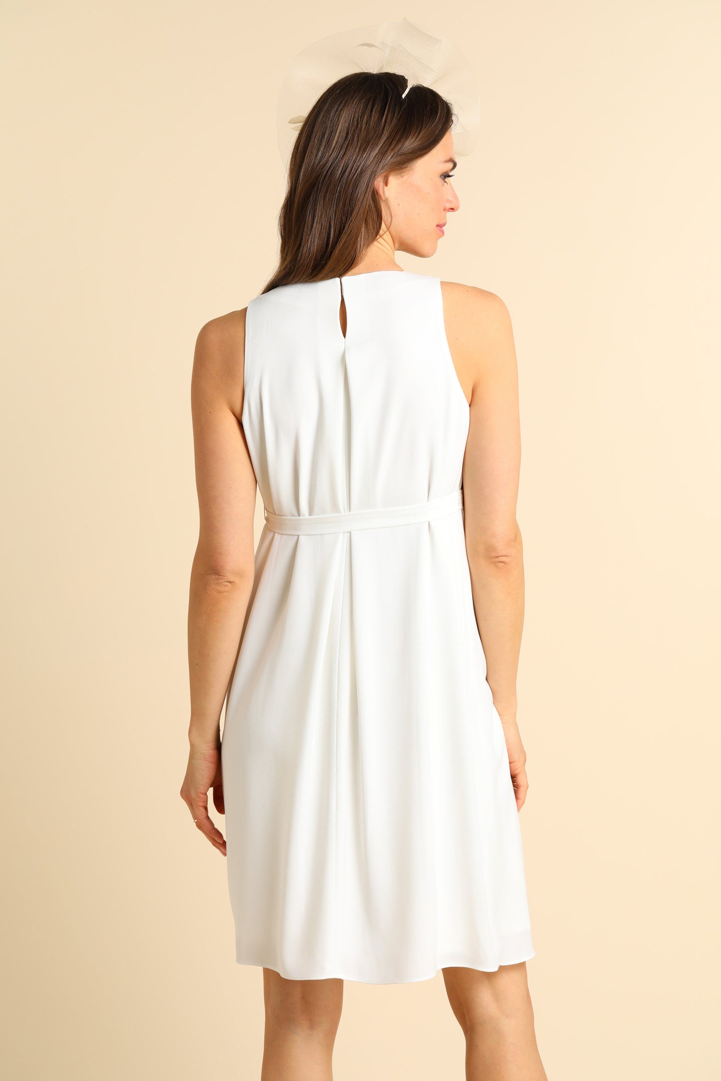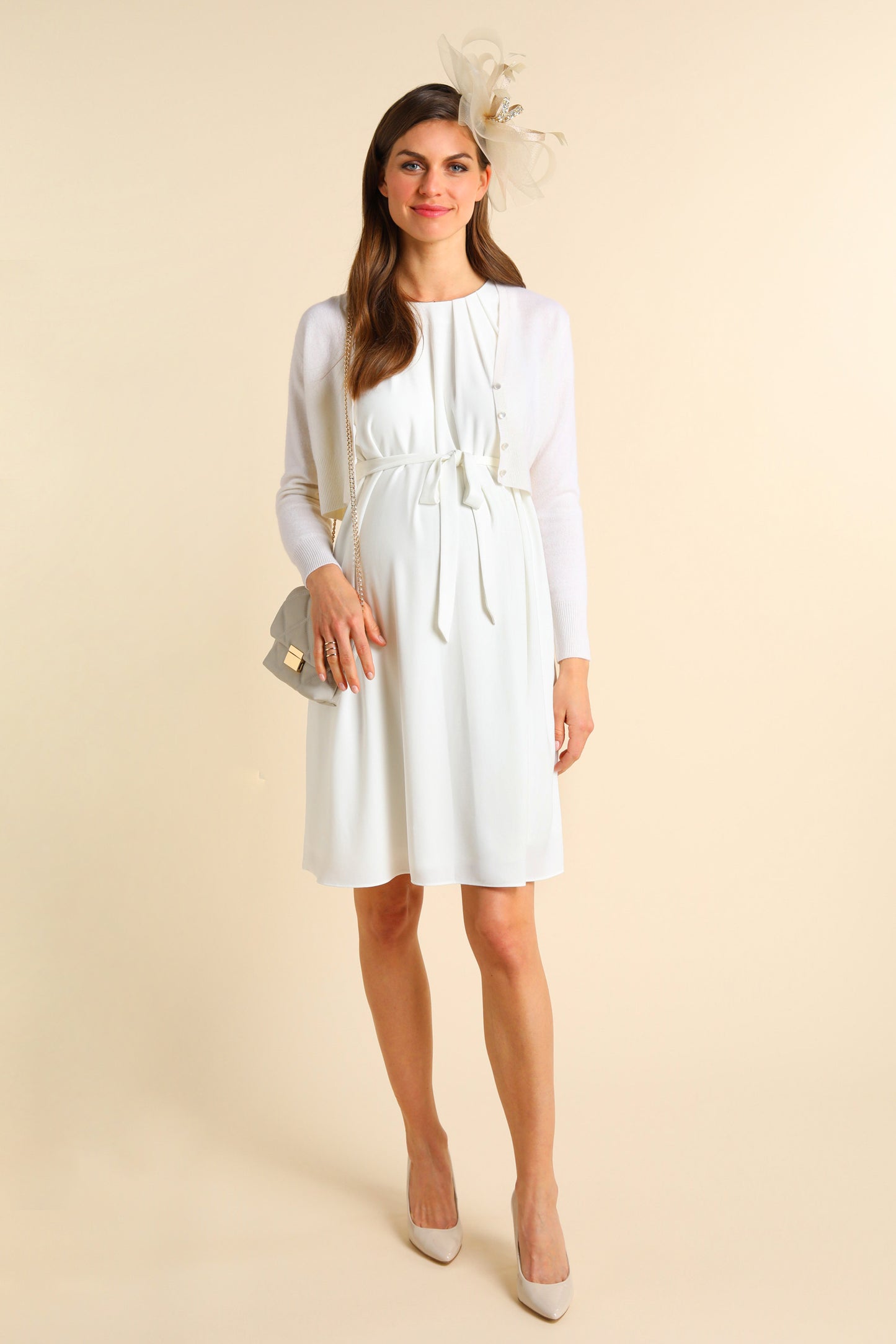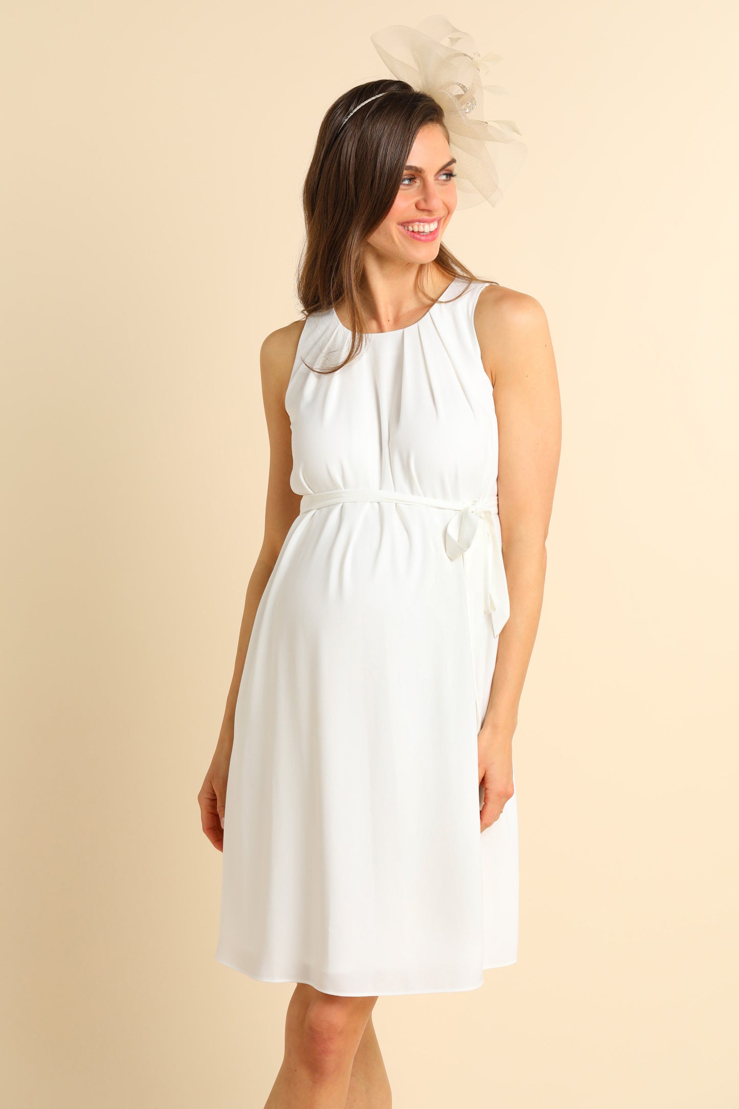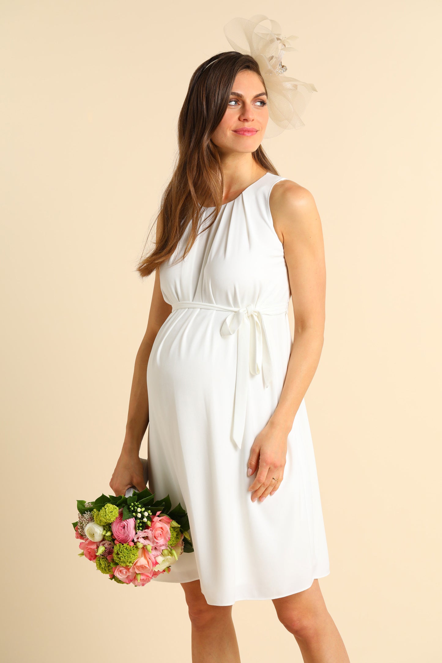 Chiffon Umstandsbrautkleid mit stillfreundlichem Cache-Coeur Ausschnitt und ausgestellten Ärmeln. Das elastische, breite Band unterhalb der Brust wird im Rücken zu einer Schleife gebunden und schafft eine schmeichelhafte Silhouette, egal ob du mit Baby im Bauch oder Baby im Arm heiratest. Ein gesmokter Einsatz im Rücken sorgt für extra Flexibilität und einen perfekten Fit. Zierfalten lassen den Rockteil fließend über deinen Bauch fallen. Das Kleid wird über einen versteckten Reißverschluss an der Seite geschlossen.