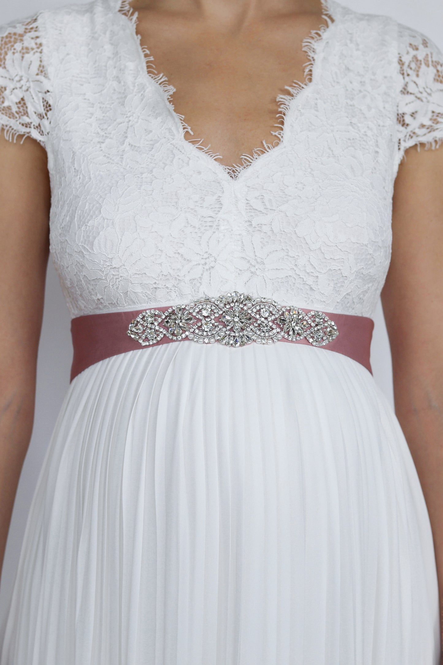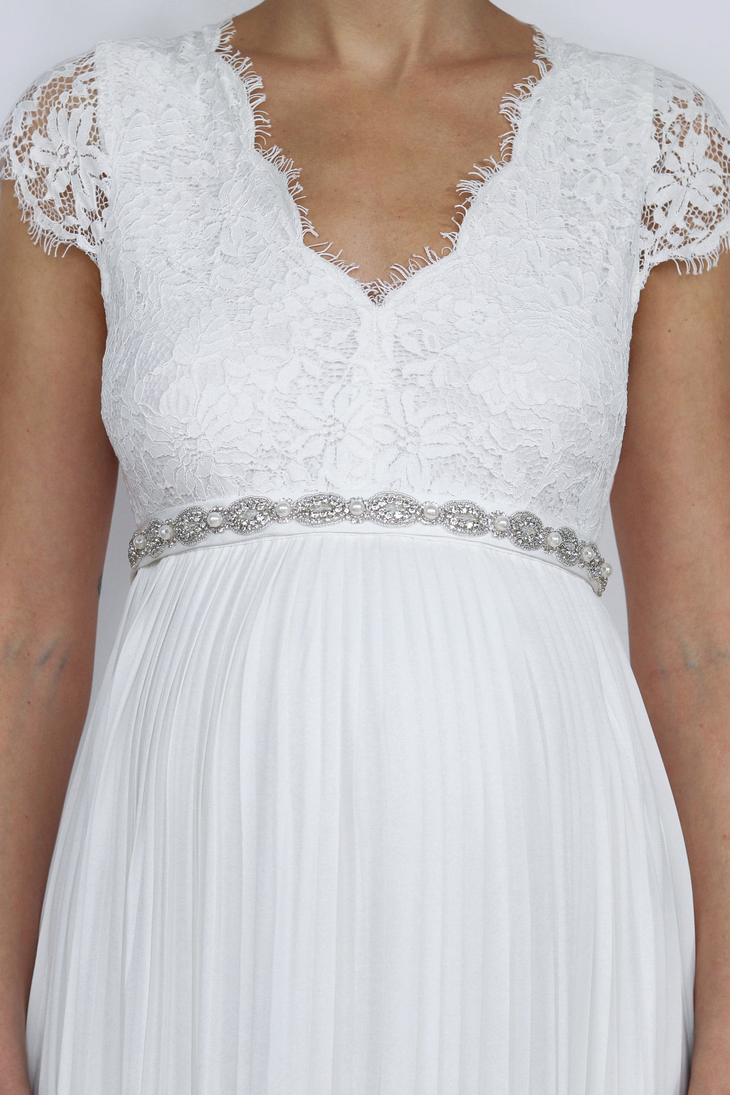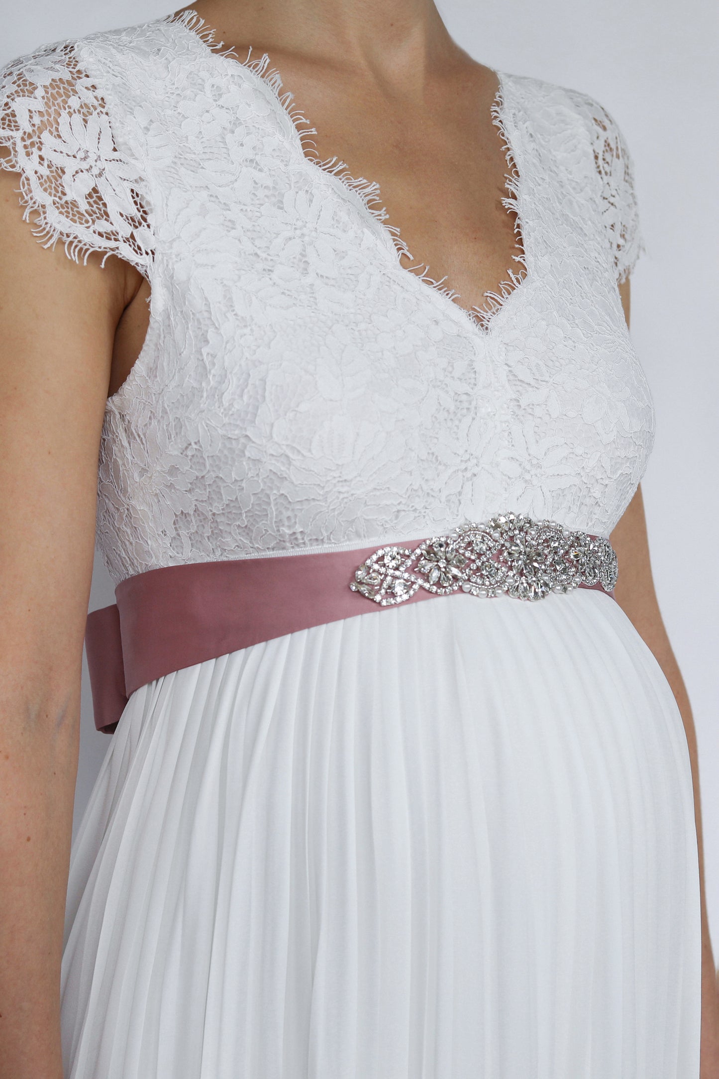 Exklusive Umstandsbrautrobe aus feinstem Chiffon aus unserer Bridal Luxe Linie, veredelt mit edlen Spitzenapplikationen. Vorgeformte Cups im Oberteil und ein tiefer V-Ausschnitt schaffen ein wunderschönes Dekolletee. Der Rock aus mehreren Lagen Chiffon und einem samtweichen Baumwolle Futter fällt fließend bis zum Boden und unterstreicht die klassische A-Linien-Silhouette. Im Rücken befindet sich ein tiefer Ausschnitt, der mit einem verdeckten Reißverschluss geschlossen wird.