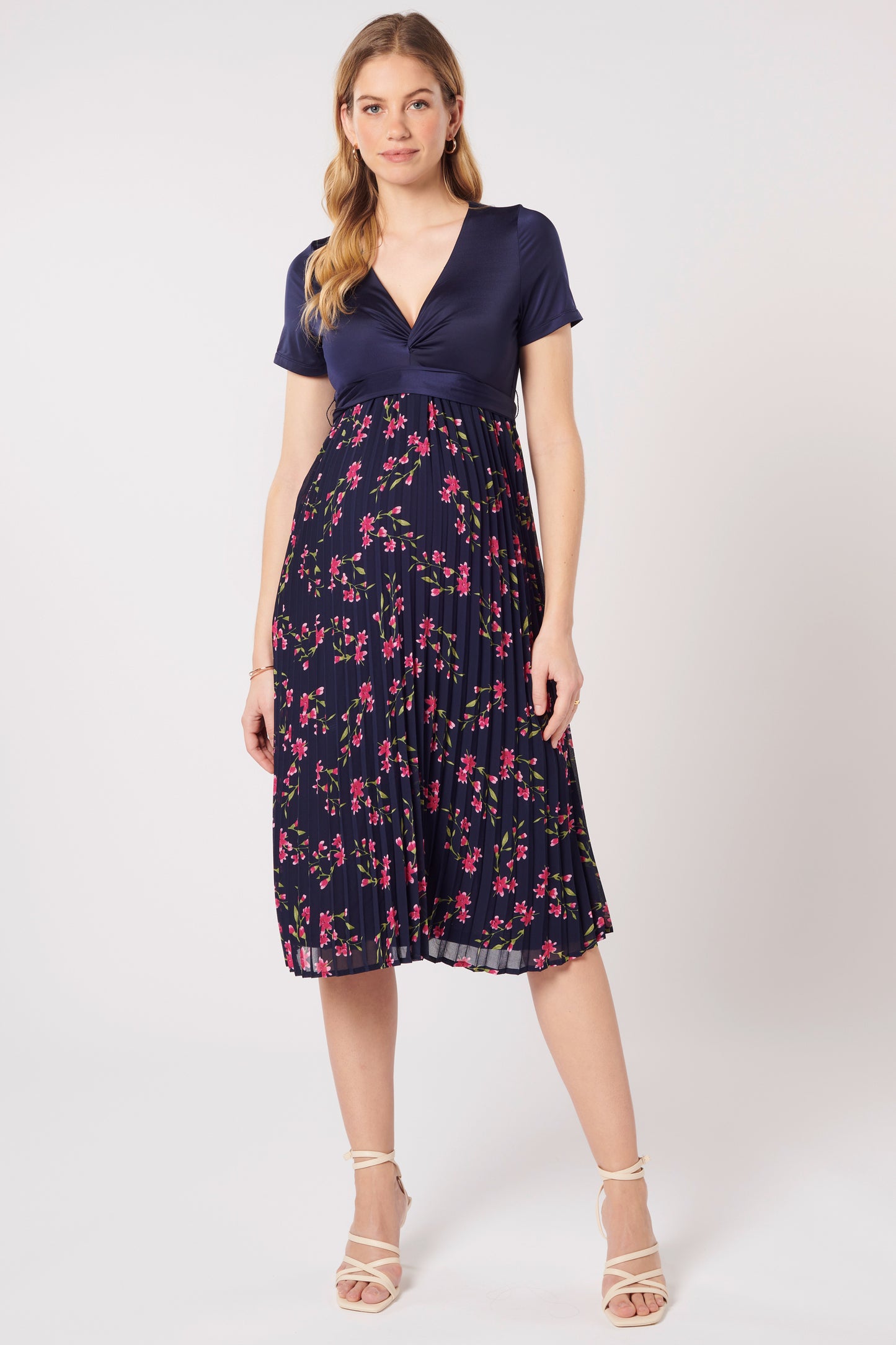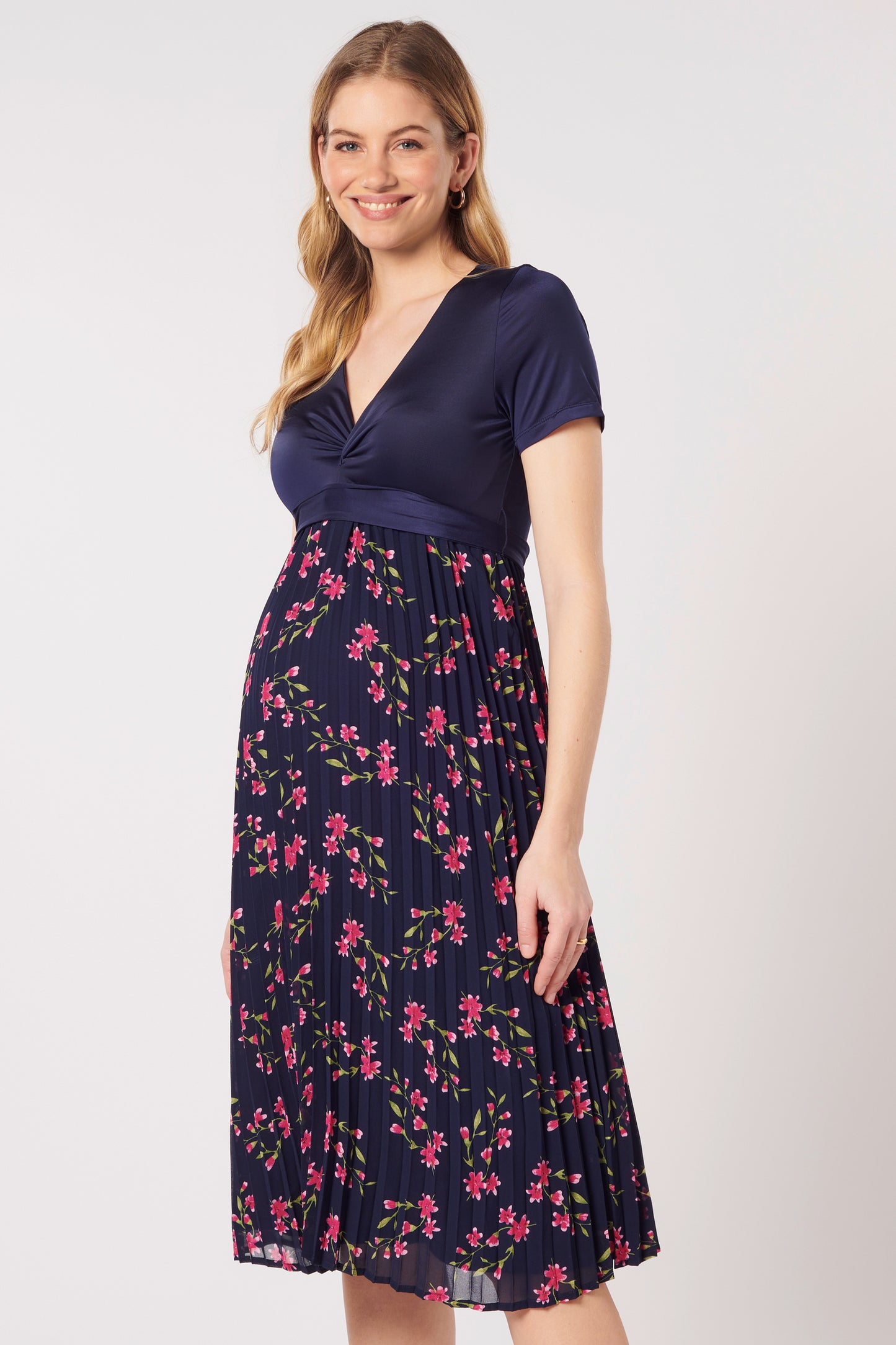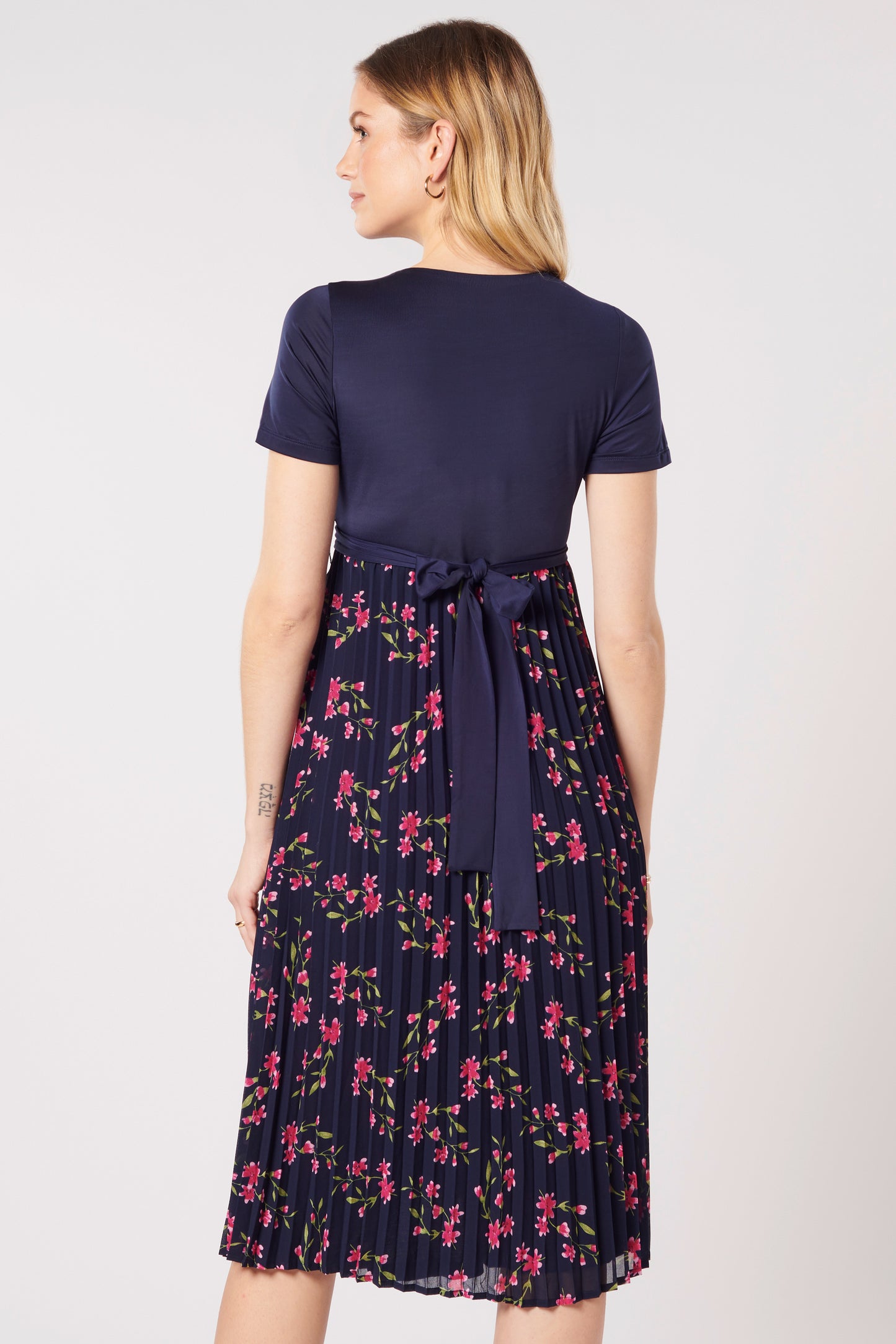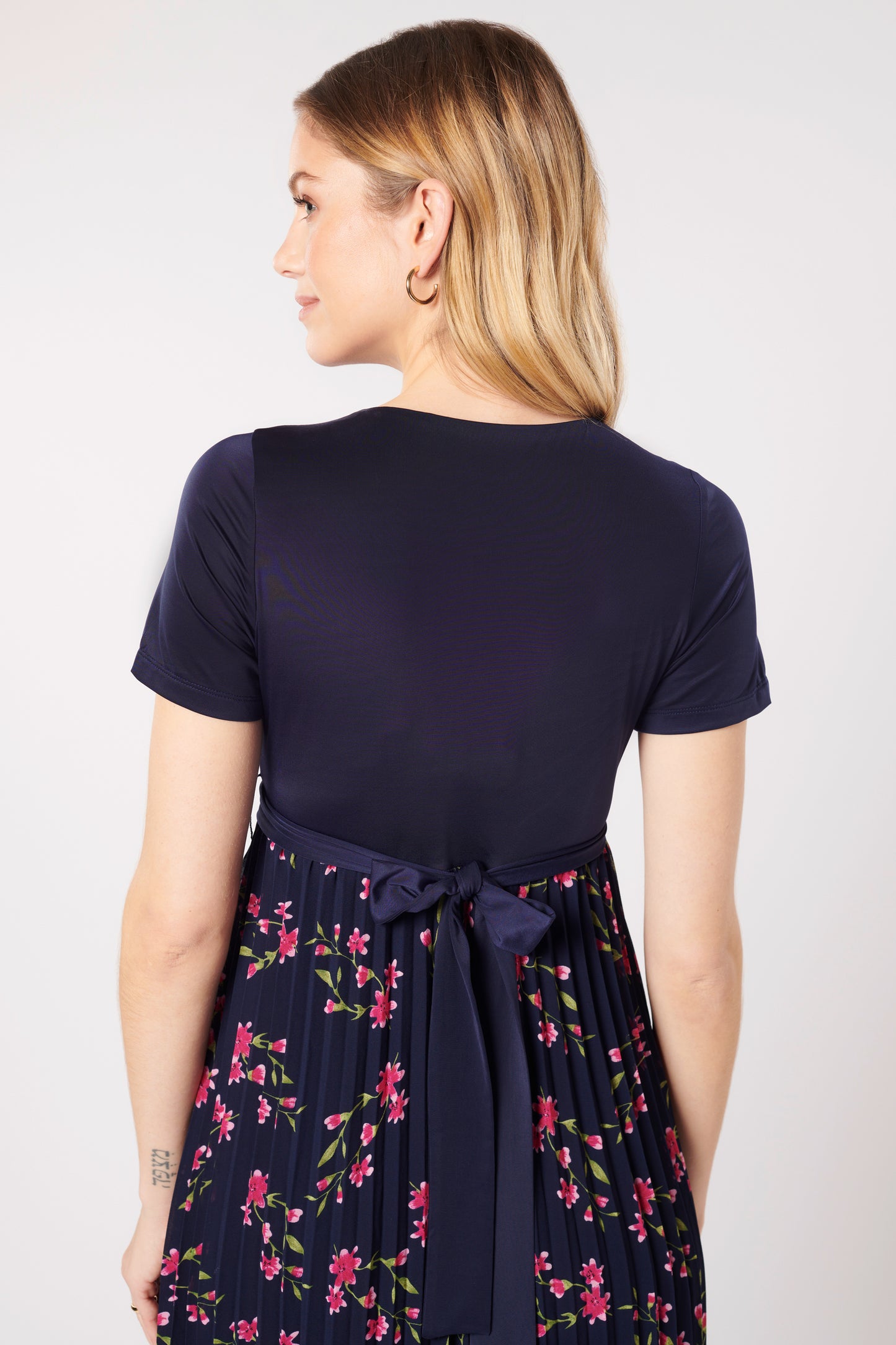 Umstandskleid in A-Linie aus luftigem Chiffon mit Rückenausschnitt und integriertem Bindegürtel. Der überkreuzte V-Ausschnitt vorne wird durch einen tiefen Rückenausschnitt ergänzt, der deinen Nacken besonders schön betont. Kleinere Falten in der vorderen Mitte und ein gesmokter Tailleneinsatz im Rücken sorgen für eine optimale Passform in allen Schwangerschaftswochen. Das Unterkleid aus weicher Viskose sorgt für ein angenehmes Tragegefühl. Durch den integrierten Bindegürtel kannst du das Kleid flexibel an deine Silhouette anpassen, sowohl mit als auch ohne Babybauch.