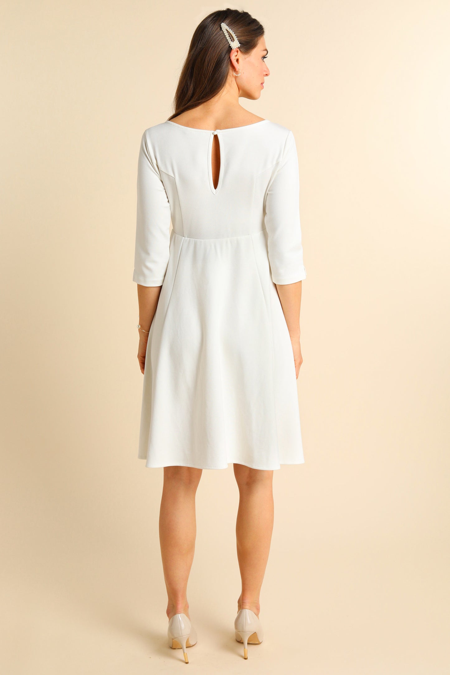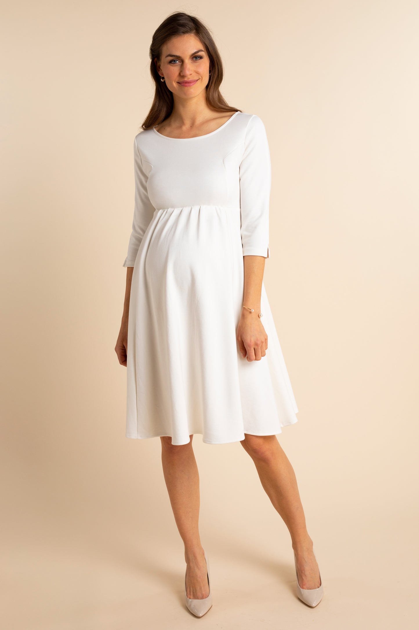 Regulärer Preis € 139,00Umstandsbrautkleid in A-Linie aus nachhaltiger EcoVero™ Viskose*. Das knielange Brautkleid für Schwangere hat 3/4 Ärmel, einen U-Boot-Ausschnitt und ein dekoratives Keyhole-Detail im Rücken. Eine elastische Naht zwischen Brust und Bauch sorgt für einen perfekten Fit, egal wie groß dein Babybauch am Hochzeitstag ist. Der schwingende Rock gibt dem Brautkleid einen besonders eleganten Look. Das Kleid wird auf der Rückseite mit einem Knopf geschlossen.