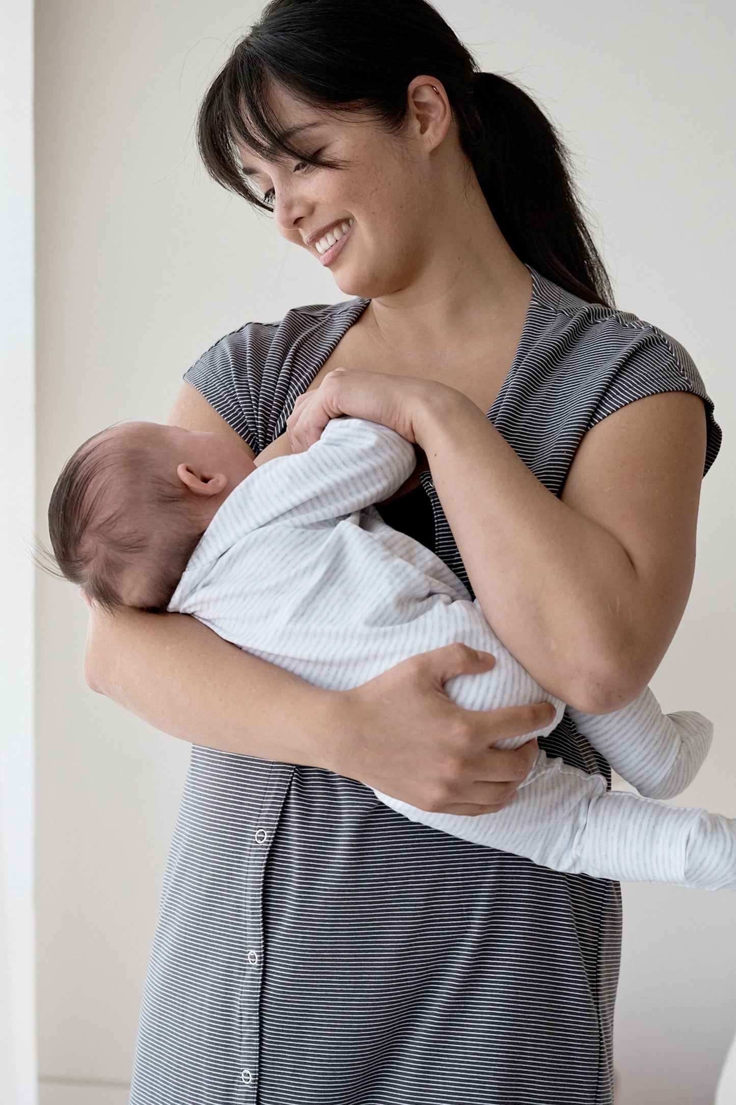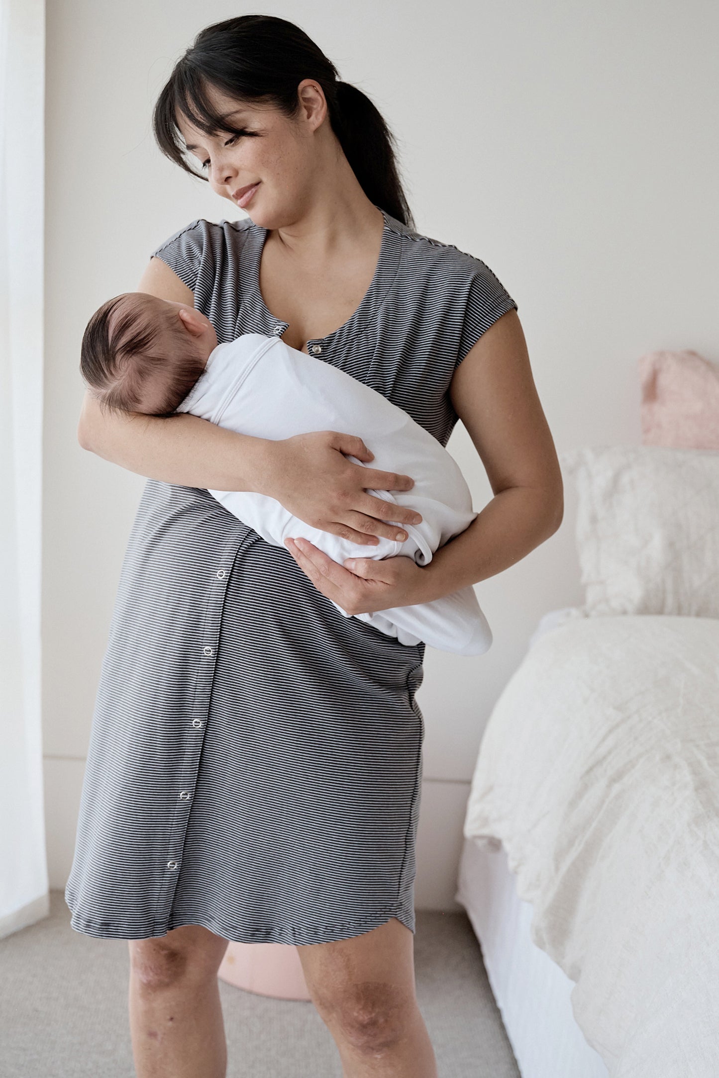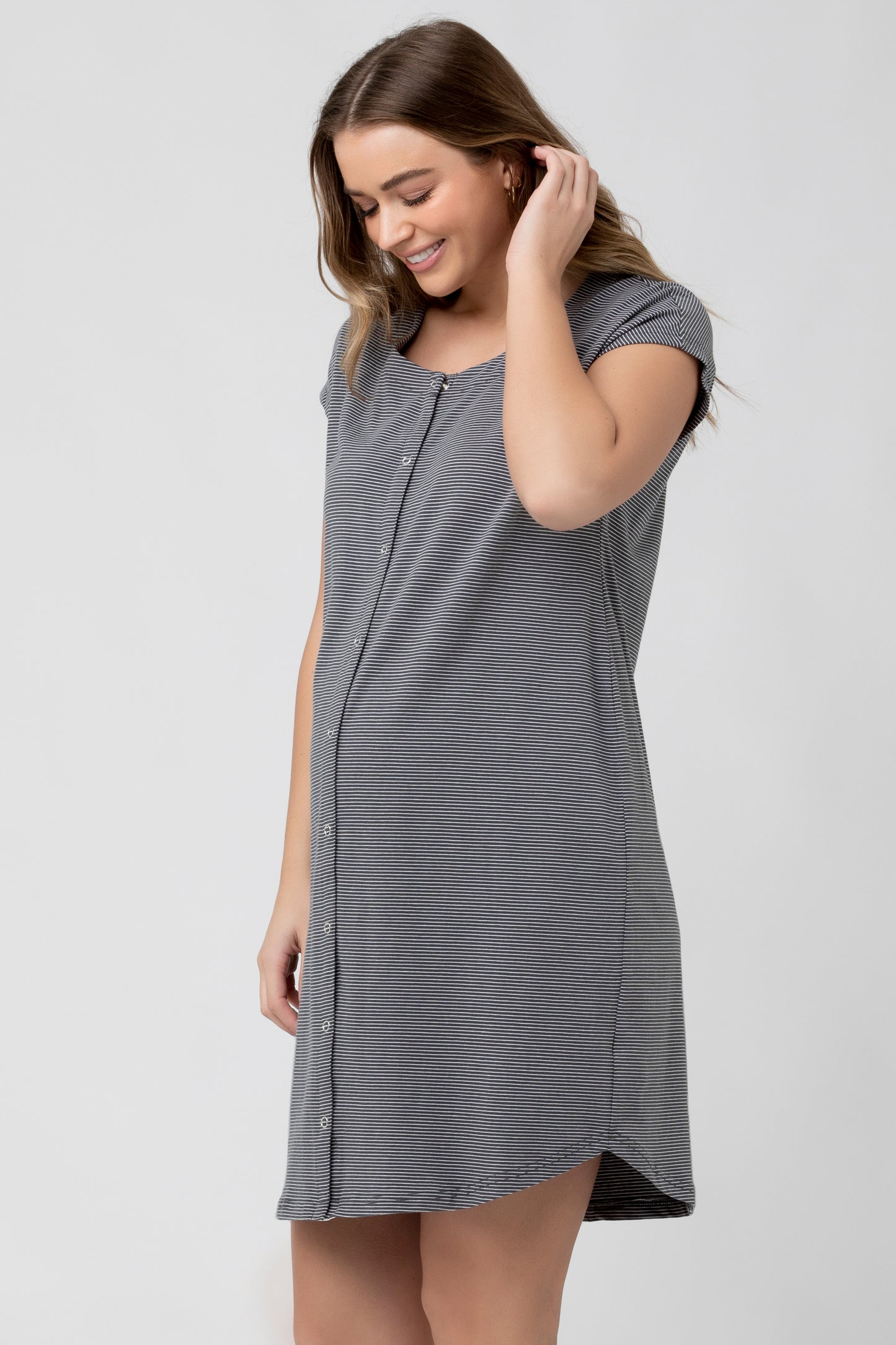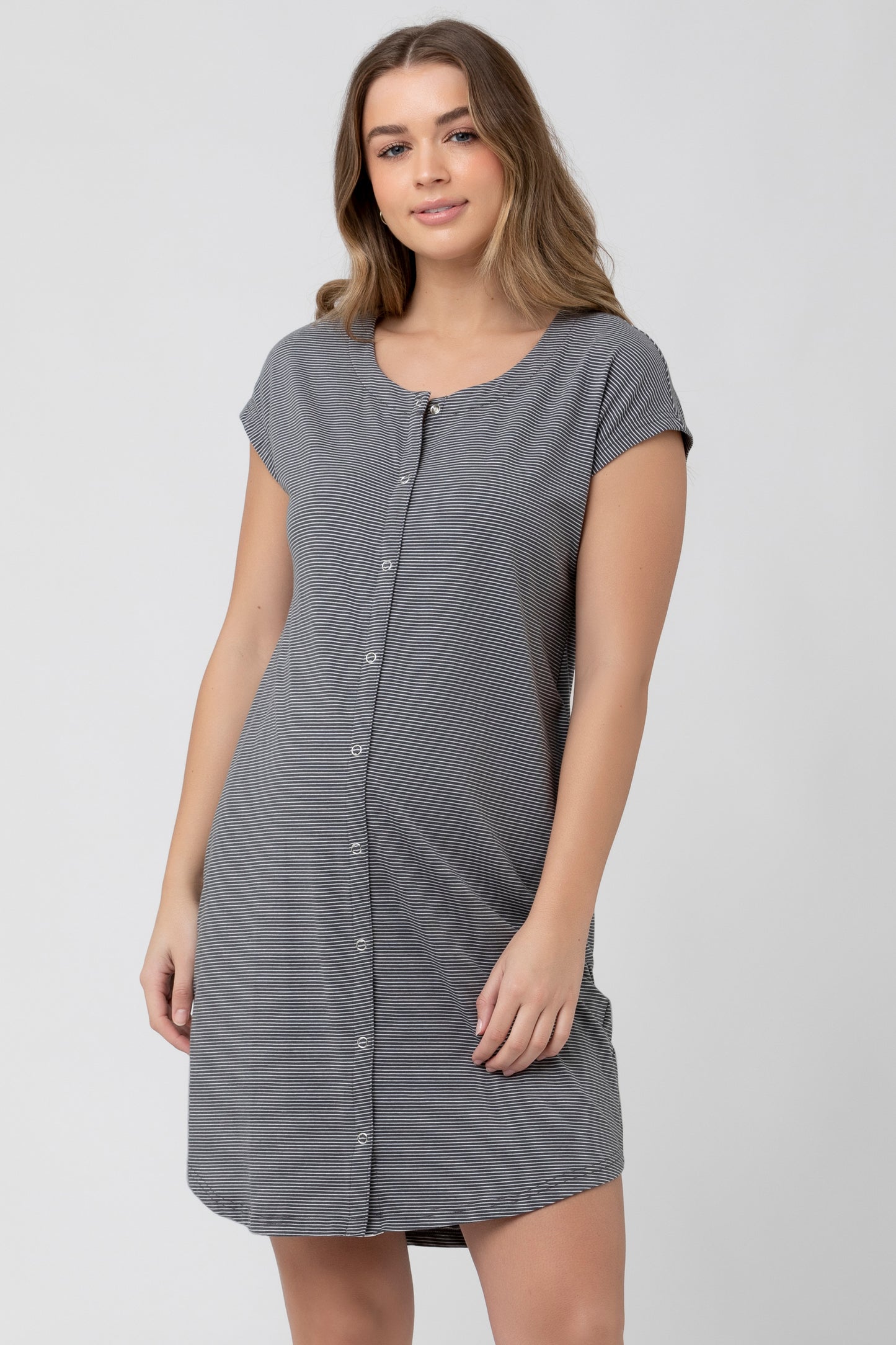 Organic Umstands- und Stillnachthemd aus weicher Bio-Baumwolle mit kurzen Ärmeln und durchgehender Knopfleiste. Nach der Geburt erhältst du über diese einen schnellen und einfachen Stillzugang und kannst so jederzeit nachts problemlos stillen.