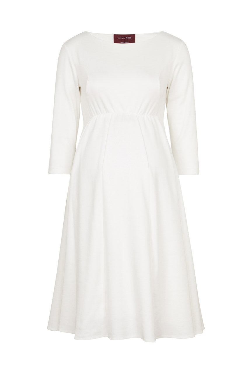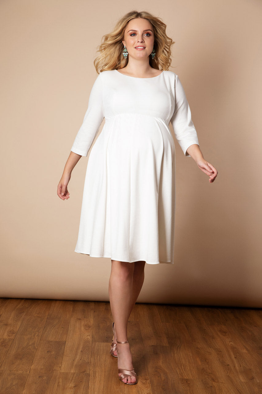 Hier findest du das Kleid in Größe 34-46: Midi Umstandsbrautkleid mit Plissees